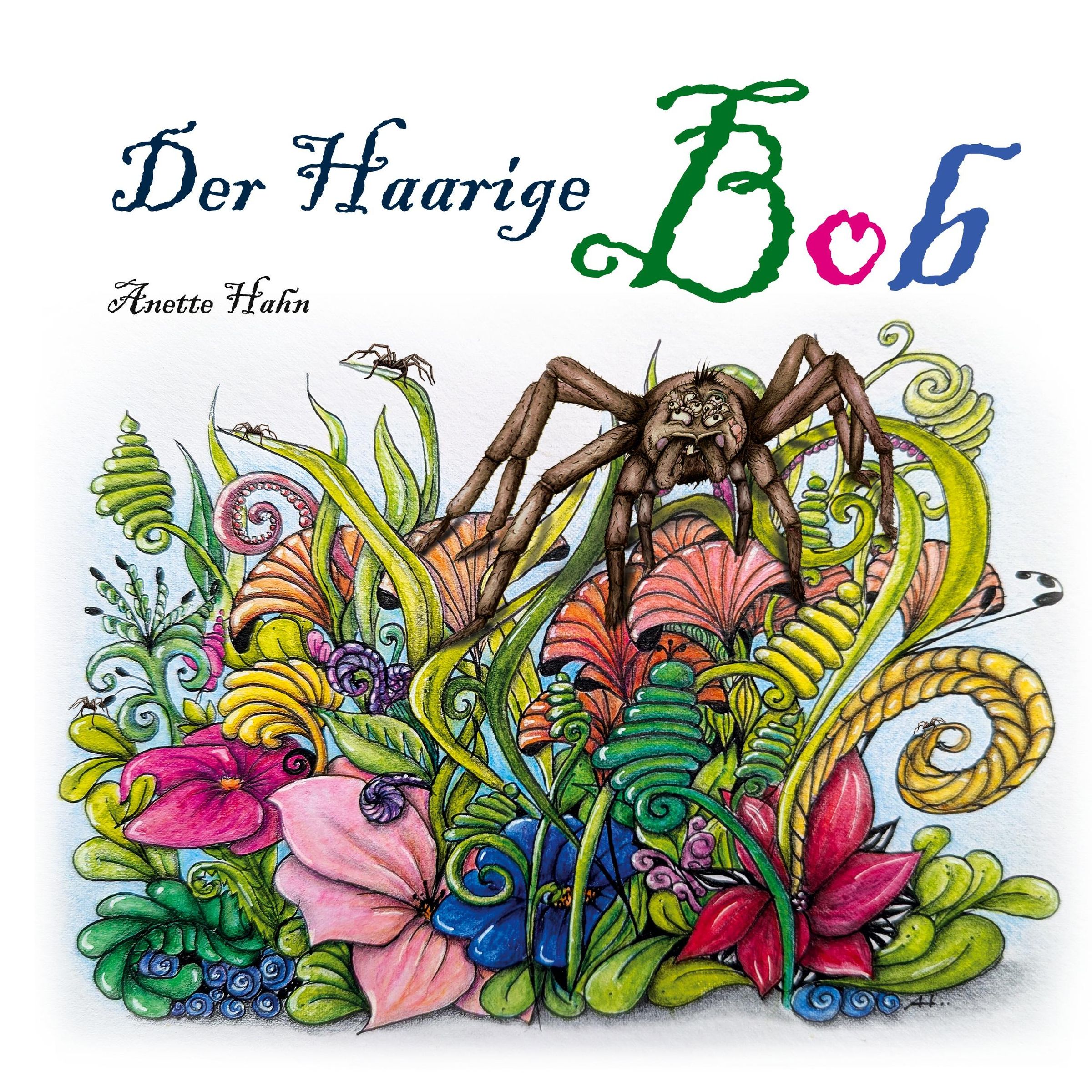 „Der Haarige Bob“, Anette Hahn. Illustration: Eine große Spinne auf buntem, detailreichem Blumen- und Pflanzenmuster., Buch