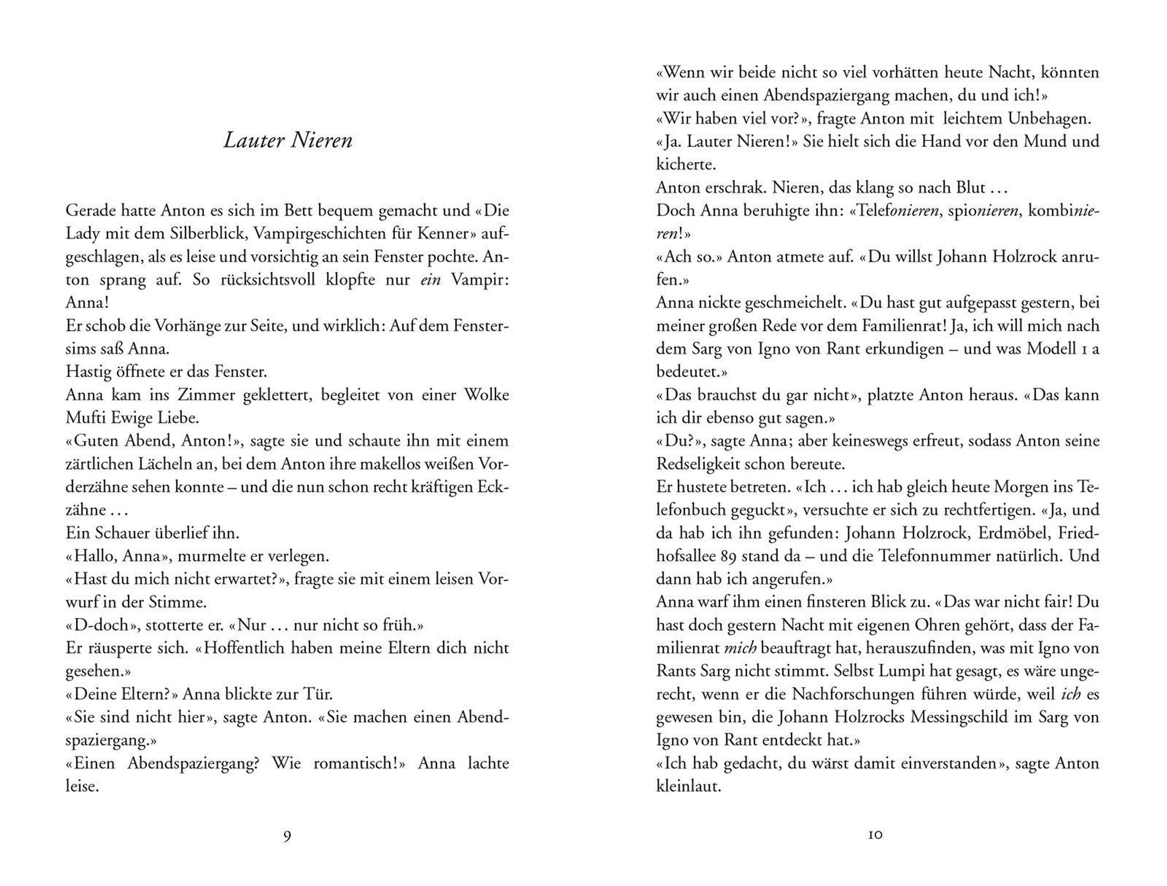 Anna, Anton und Rüdiger versuchen, mehr über den dubiosen Igno von Rant herauszufinden. Dafür nehmen sie die Firma <<Erdmöbel>> von Herrn Holzrock genauer unter die Lupe. Und dann kommt auch noch der mysteriöse Doktor Gans mit seinem giftgrünen Lieferwagen ins Spiel. Igno von Rant ist zwar Tante Dorothees Verlobter - aber ist er auch ein echter Vampir?