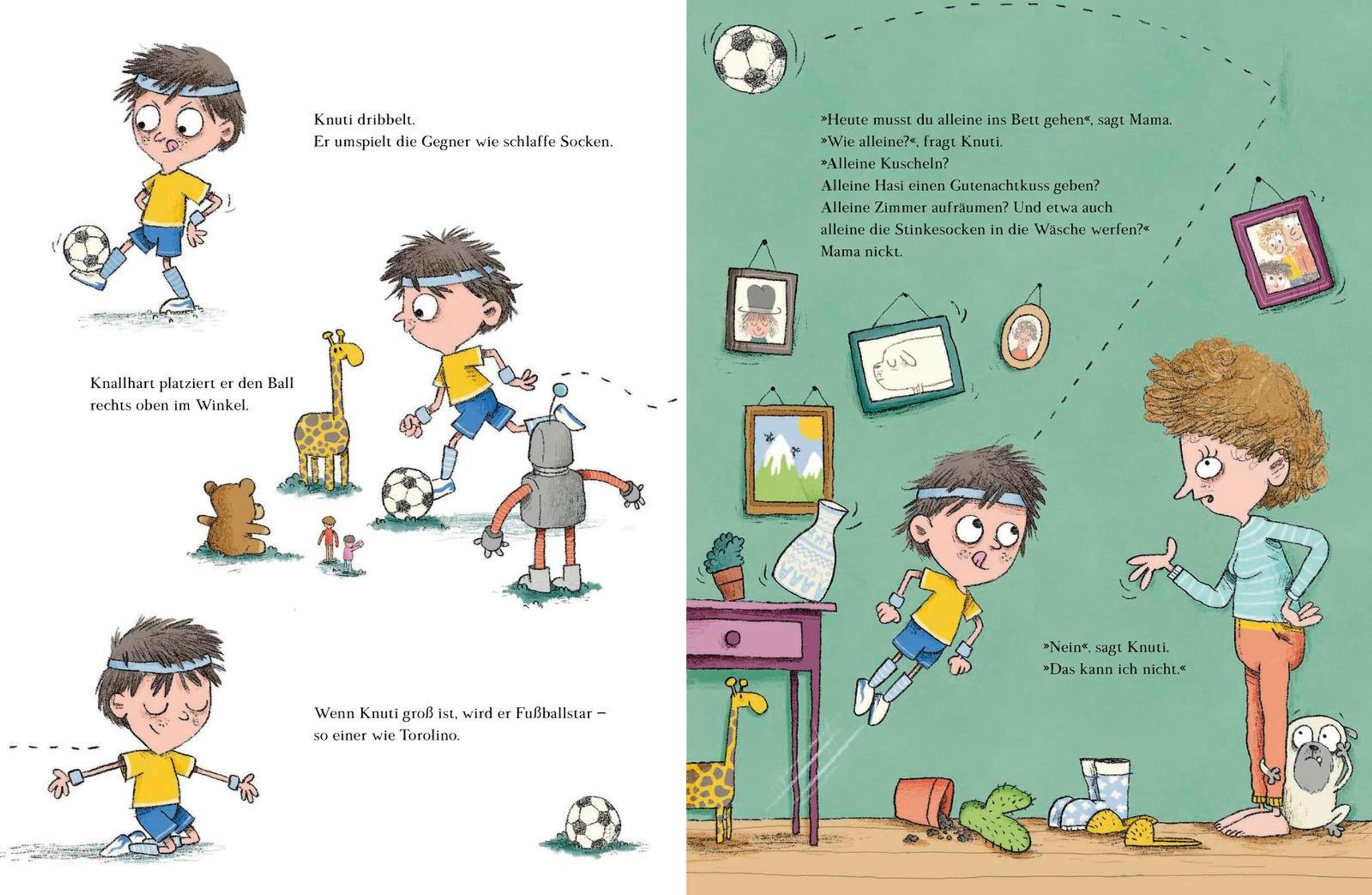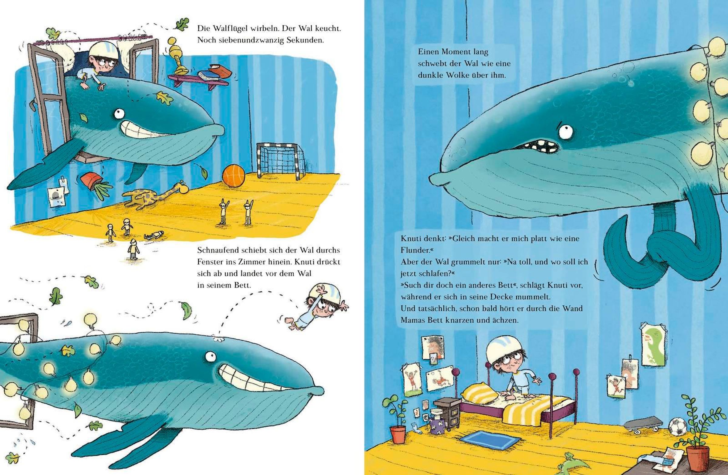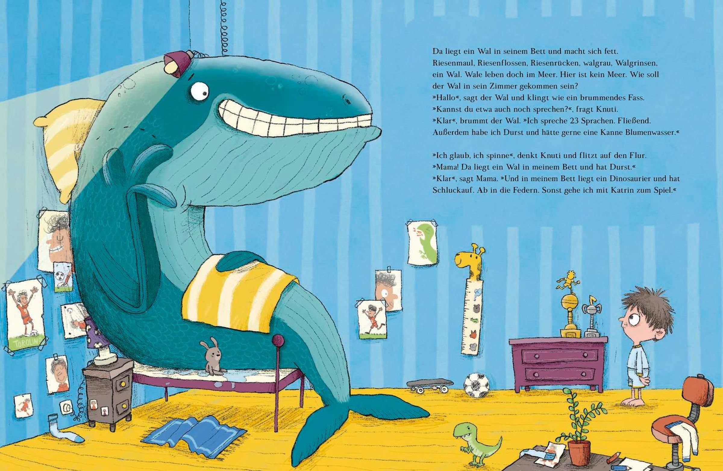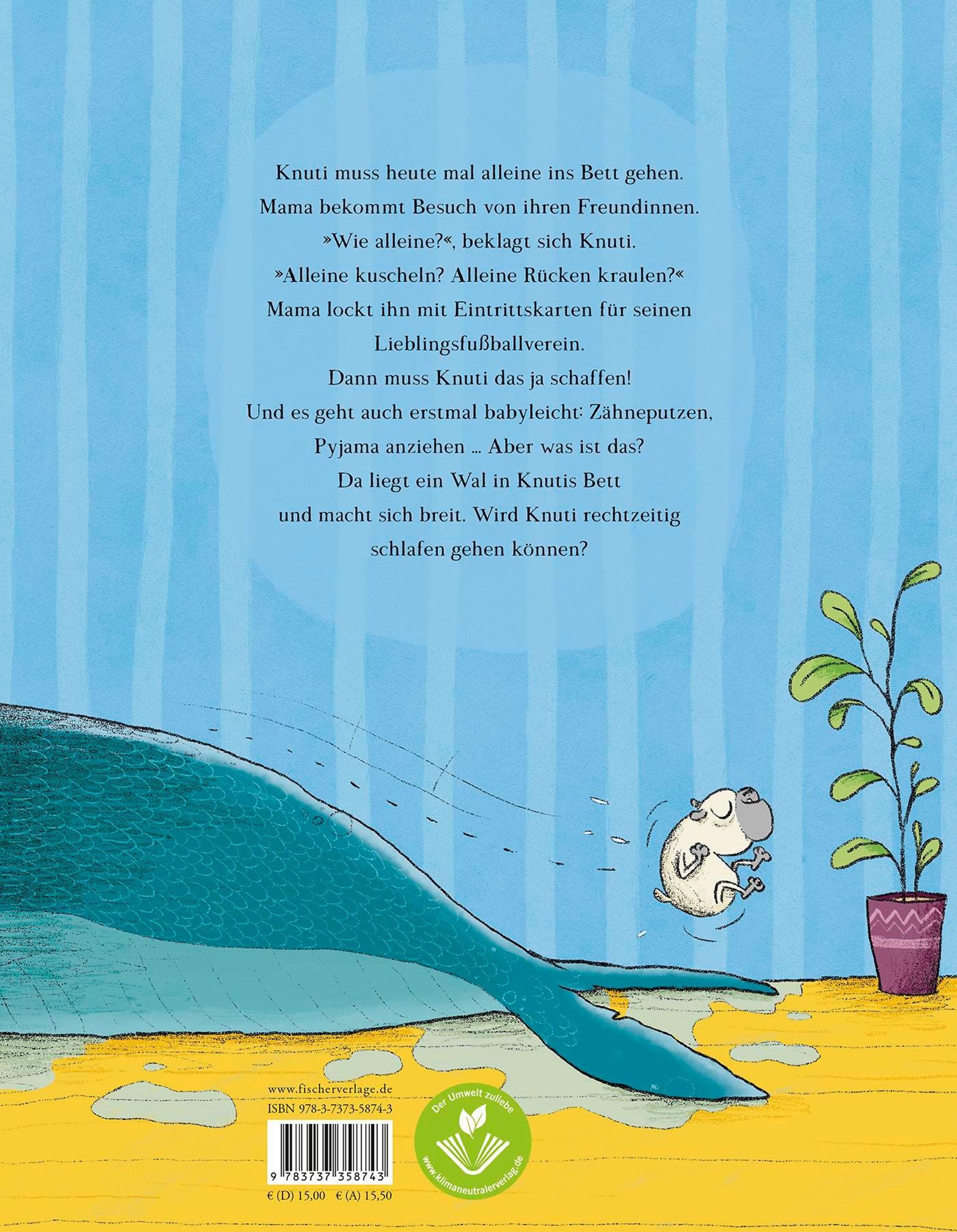 Knuti muss heute mal alleine ins Bett gehen. Mama hat Besuch von ihren Freundinnen. >>Wie alleine?<<, beklagt sich Knuti. >>Alleine kuscheln? Alleine Rücken kraulen?<< Mama lockt ihn mit Eintrittskarten für seinen Lieblingsfußballverein. Dann muss Knuti das schaffen! Und es geht auch babyleicht. Zähneputzen, Pyjama anziehen ... Aber was ist das? Da liegt ein Wal in Knutis Bett, macht sich breit und denkt gar nicht daran, zu verschwinden. Jetzt läuft die Zeit. Der Wal ist ziemlich frech aber Knuti ist schlau und schafft es in letzter Minute alleine im Bett zu liegen.