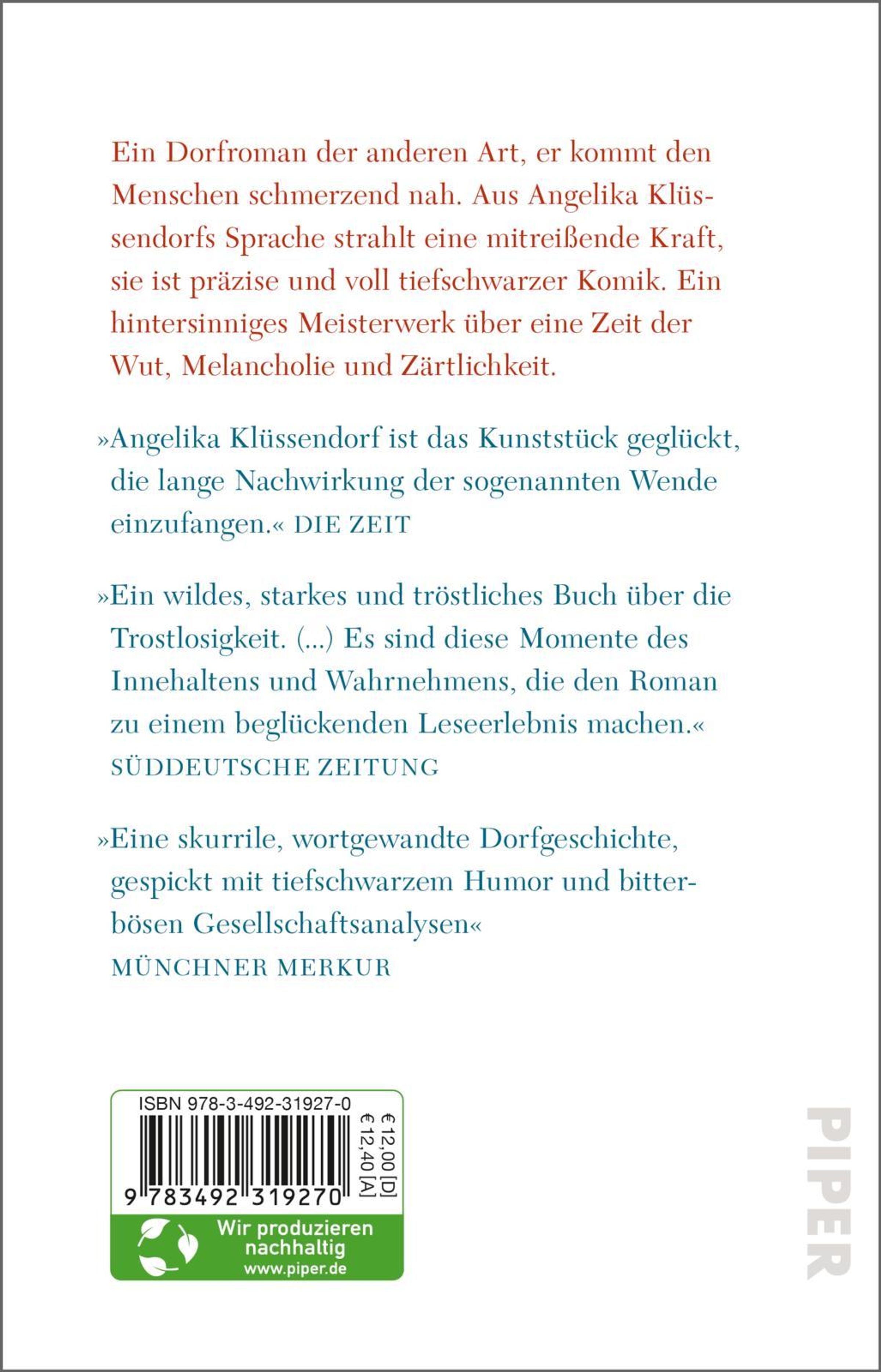 >>Vierunddreißigster September<< wird zum Dorfroman einer anderen, neuen Art, er kommt den Menschen schmerzend nah. Aus Angelika Klüssendorfs Sprache strahlt eine mitreißende Kraft, sie ist präzise und voll tiefschwarzer Komik. Ein hintersinniges Meisterwerk über eine Zeit der Wut, Melancholie und Zärtlichkeit.