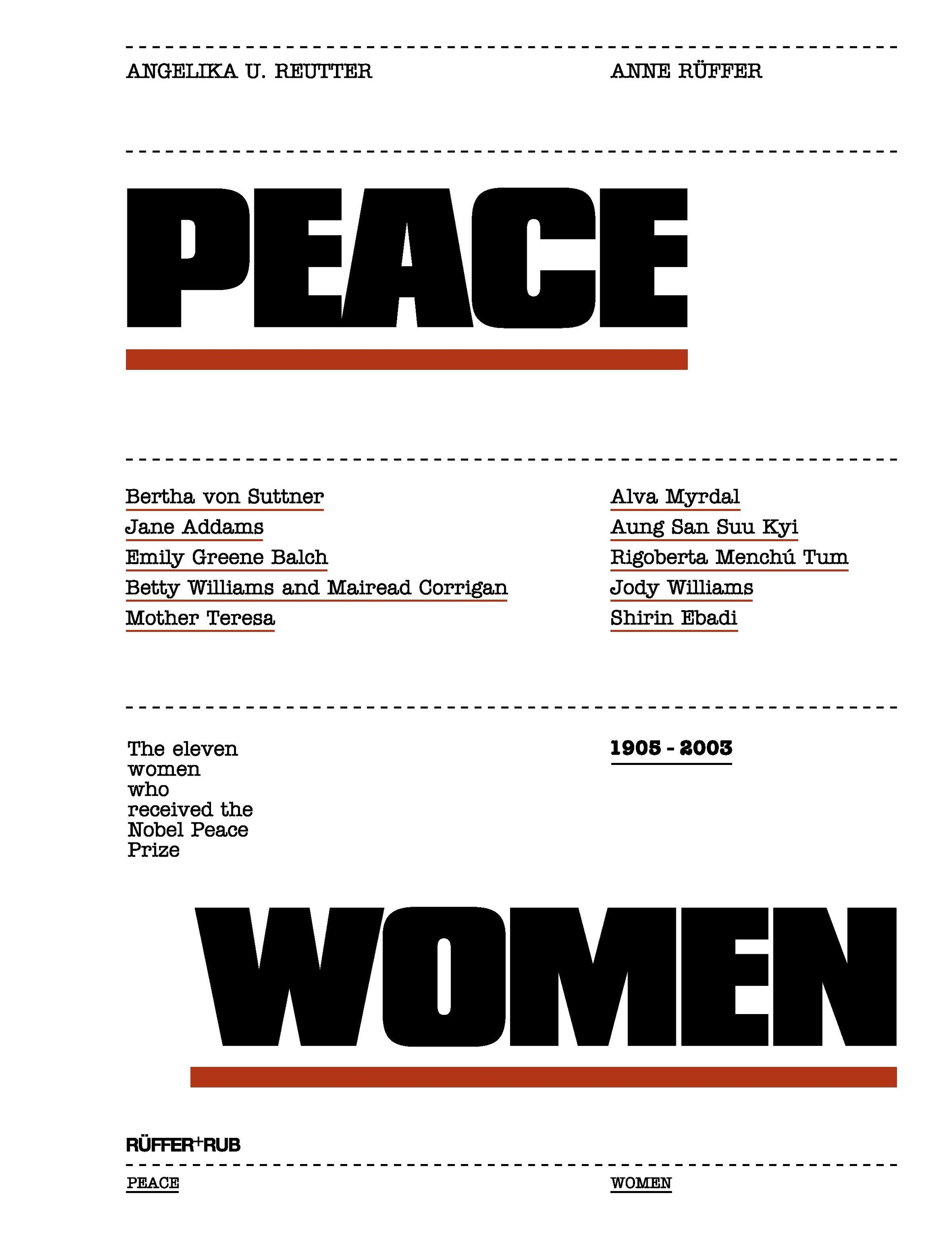 Bertha von Suttner ¿ Jane Addams ¿ Emily Greene Balch ¿ Betty Williams and Mairead Corrigan ¿ Mother Teresa ¿ Alva Myrdal ¿ Aung San Suu Kyi ¿ Rigoberta Menchú Tum ¿ Jody Williams ¿ Shirin Ebadi