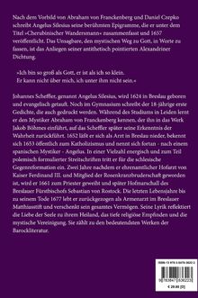 Johannes Scheffler, genannt Angelus Silesius, wird 1624 in Breslau geboren und evangelisch getauft. Noch im Gymnasium schreibt der 18-jährige erste Gedichte, die auch gedruckt werden. Während des Studiums in Leiden lernt er den Mystiker Abraham von Franckenberg kennen, der ihn in das Werk Jakob Böhmes einführt, auf das Scheffler später seine Erkenntnis der Wahrheit zurückführt. 1652 läßt er sich als Arzt in Breslau nieder, bekennt sich 1653 öffentlich zum Katholizismus und nennt sich fortan - nach einem spanischen Mystiker - Angelus. In einer Vielzahl energisch und zum Teil polemisch formulierter Streitschriften tritt er für die schlesische Gegenreformation ein. Zwei Jahre nachdem er ehrenamtlicher Hofarzt von Kaiser Ferdinand III. und Mitglied der Rosenkranzbruderschaft geworden ist, wird er 1661 zum Priester geweiht und später Hofmarschall des Breslauer Fürstbischofs Sebastian von Rostock. Die letzten Lebensjahre bis zu seinem Tode 1677 lebt er zurückgezogen als Armenarzt im Breslauer Matthiasstift und verschenkt sein gesamtes Vermögen. Seine Lyrik reflektiert die Liebe der Seele zu ihrem Heiland, das tiefe religiöse Empfinden und die mystische Vereinigung. Sie zählt zu den bedeutendsten Werken der Barockliteratur.