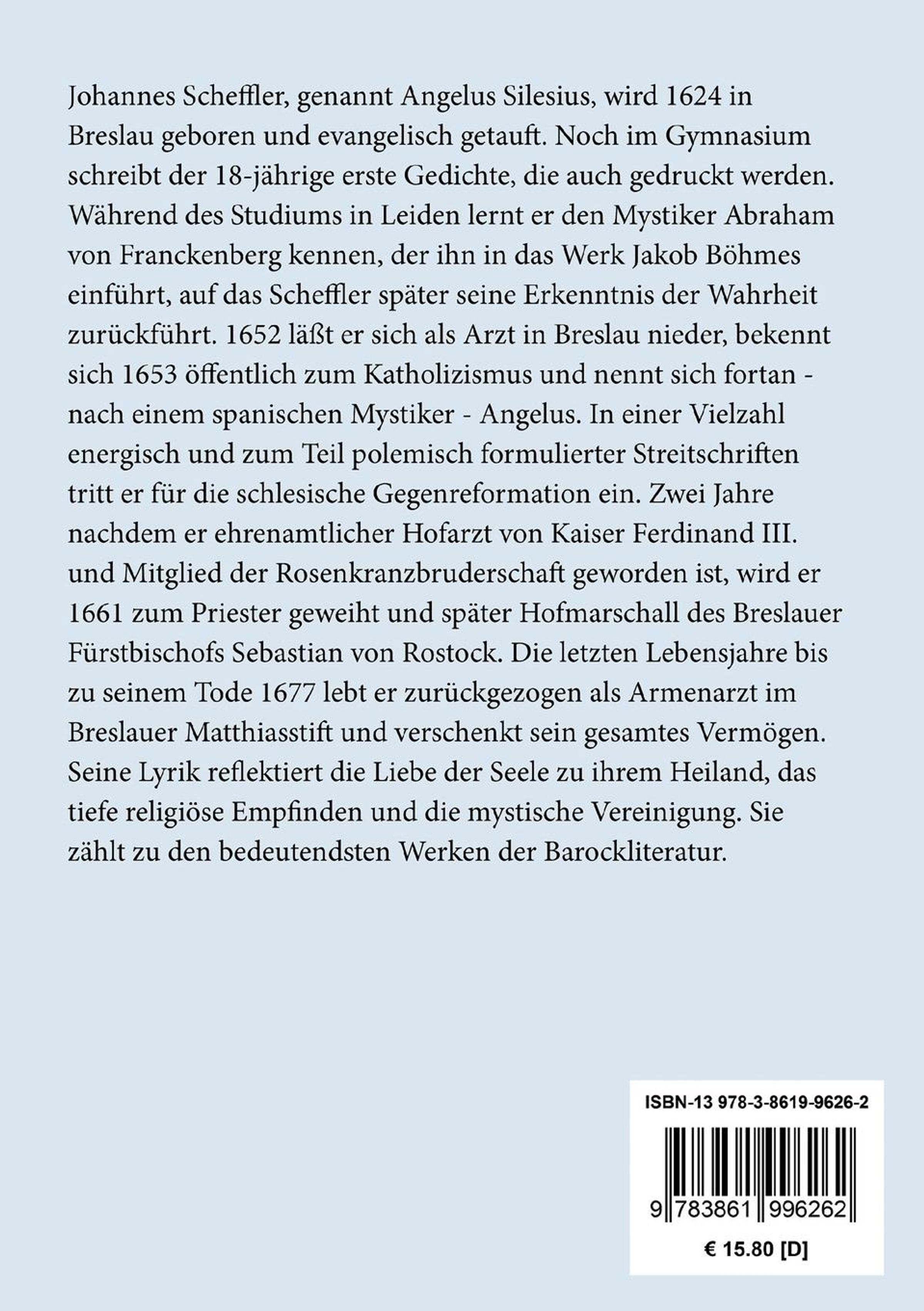 Johannes Scheffler, genannt Angelus Silesius, wird 1624 in Breslau geboren und evangelisch getauft. Noch im Gymnasium schreibt der 18-jährige erste Gedichte, die auch gedruckt werden. Während des Studiums in Leiden lernt er den Mystiker Abraham von Franckenberg kennen, der ihn in das Werk Jakob Böhmes einführt, auf das Scheffler später seine Erkenntnis der Wahrheit zurückführt. 1652 läßt er sich als Arzt in Breslau nieder, bekennt sich 1653 öffentlich zum Katholizismus und nennt sich fortan - nach einem spanischen Mystiker - Angelus. In einer Vielzahl energisch und zum Teil polemisch formulierter Streitschriften tritt er für die schlesische Gegenreformation ein. Zwei Jahre nachdem er ehrenamtlicher Hofarzt von Kaiser Ferdinand III. und Mitglied der Rosenkranzbruderschaft geworden ist, wird er 1661 zum Priester geweiht und später Hofmarschall des Breslauer Fürstbischofs Sebastian von Rostock. Die letzten Lebensjahre bis zu seinem Tode 1677 lebt er zurückgezogen als Armenarzt im Breslauer Matthiasstift und verschenkt sein gesamtes Vermögen. Seine Lyrik reflektiert die Liebe der Seele zu ihrem Heiland, das tiefe religiöse Empfinden und die mystische Vereinigung. Sie zählt zu den bedeutendsten Werken der Barockliteratur.