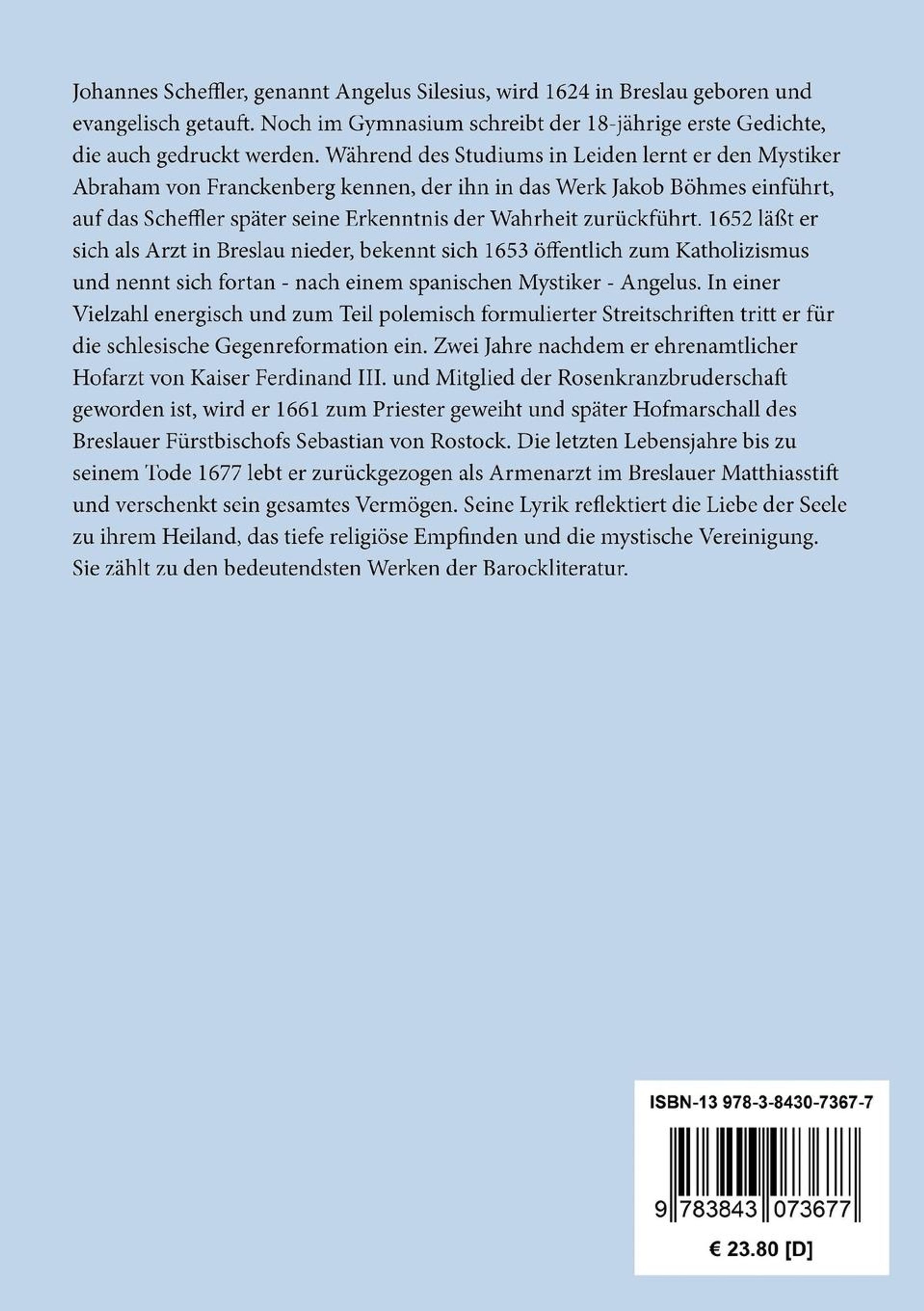 Johannes Scheffler, genannt Angelus Silesius, wird 1624 in Breslau geboren und evangelisch getauft. Noch im Gymnasium schreibt der 18-jährige erste Gedichte, die auch gedruckt werden. Während des Studiums in Leiden lernt er den Mystiker Abraham von Franckenberg kennen, der ihn in das Werk Jakob Böhmes einführt, auf das Scheffler später seine Erkenntnis der Wahrheit zurückführt. 1652 läßt er sich als Arzt in Breslau nieder, bekennt sich 1653 öffentlich zum Katholizismus und nennt sich fortan - nach einem spanischen Mystiker - Angelus. In einer Vielzahl energisch und zum Teil polemisch formulierter Streitschriften tritt er für die schlesische Gegenreformation ein. Zwei Jahre nachdem er ehrenamtlicher Hofarzt von Kaiser Ferdinand III. und Mitglied der Rosenkranzbruderschaft geworden ist, wird er 1661 zum Priester geweiht und später Hofmarschall des Breslauer Fürstbischofs Sebastian von Rostock. Die letzten Lebensjahre bis zu seinem Tode 1677 lebt er zurückgezogen als Armenarzt im Breslauer Matthiasstift und verschenkt sein gesamtes Vermögen. Seine Lyrik reflektiert die Liebe der Seele zu ihrem Heiland, das tiefe religiöse Empfinden und die mystische Vereinigung. Sie zählt zu den bedeutendsten Werken der Barockliteratur.
