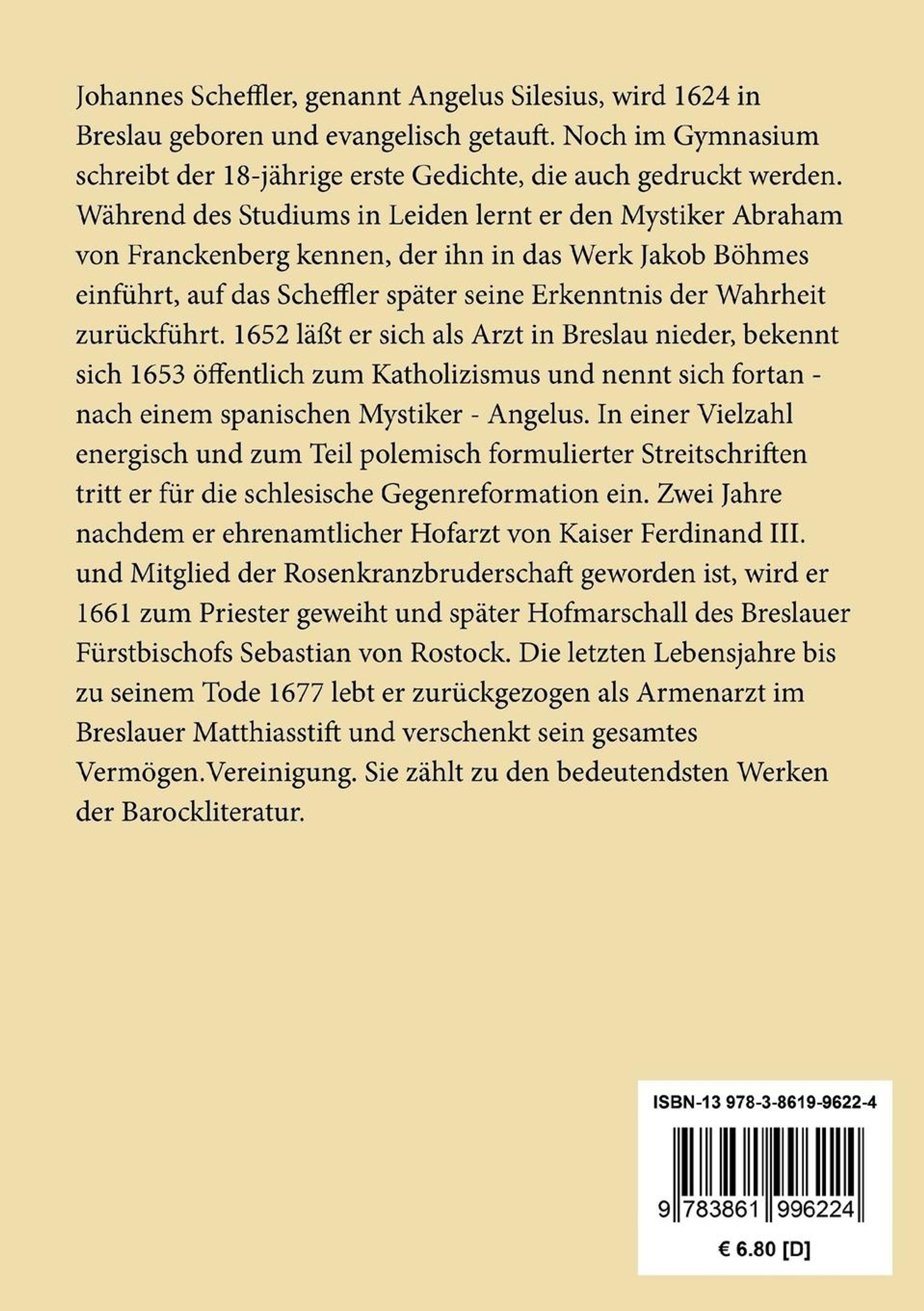 Johannes Scheffler, genannt Angelus Silesius, wird 1624 in Breslau geboren und evangelisch getauft. Noch im Gymnasium schreibt der 18-jährige erste Gedichte, die auch gedruckt werden. Während des Studiums in Leiden lernt er den Mystiker Abraham von Franckenberg kennen, der ihn in das Werk Jakob Böhmes einführt, auf das Scheffler später seine Erkenntnis der Wahrheit zurückführt. 1652 läßt er sich als Arzt in Breslau nieder, bekennt sich 1653 öffentlich zum Katholizismus und nennt sich fortan - nach einem spanischen Mystiker - Angelus. In einer Vielzahl energisch und zum Teil polemisch formulierter Streitschriften tritt er für die schlesische Gegenreformation ein. Zwei Jahre nachdem er ehrenamtlicher Hofarzt von Kaiser Ferdinand III. und Mitglied der Rosenkranzbruderschaft geworden ist, wird er 1661 zum Priester geweiht und später Hofmarschall des Breslauer Fürstbischofs Sebastian von Rostock. Die letzten Lebensjahre bis zu seinem Tode 1677 lebt er zurückgezogen als Armenarzt im Breslauer Matthiasstift und verschenkt sein gesamtes Vermögen. Seine Lyrik reflektiert die Liebe der Seele zu ihrem Heiland, das tiefe religiöse Empfinden und die mystische Vereinigung. Sie zählt zu den bedeutendsten Werken der Barockliteratur.