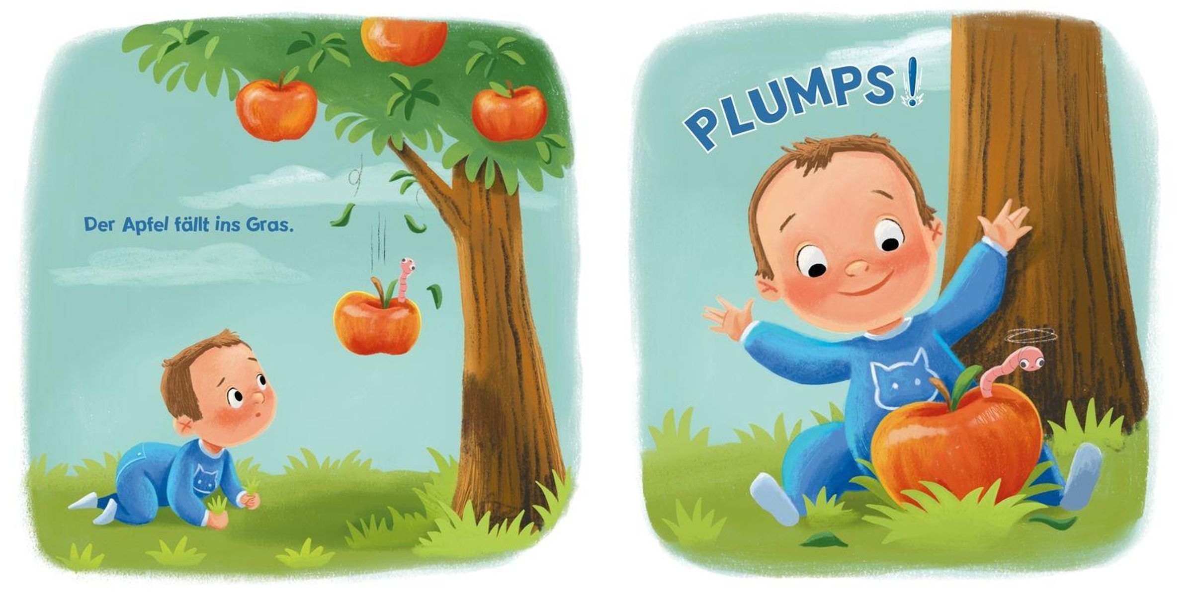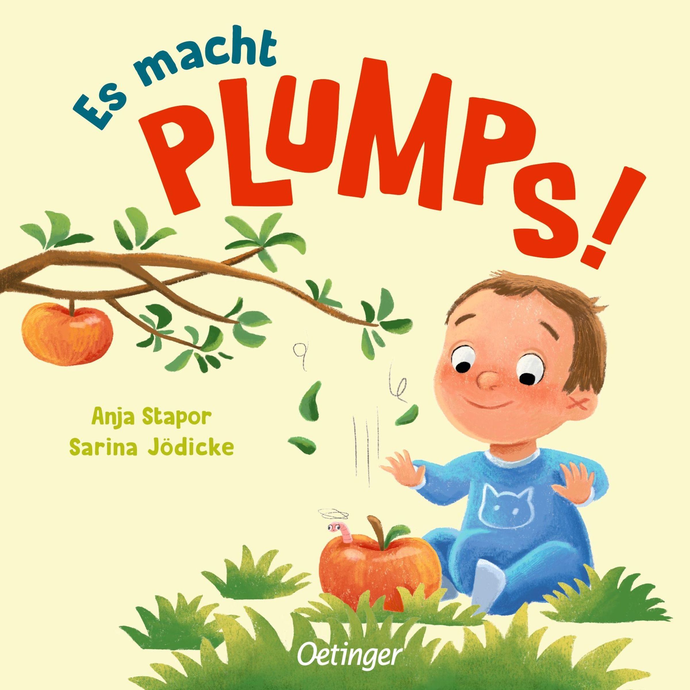 "Es macht PLUMPS!" Anja Stapor, Sarina Jödicke. Ein Kind sitzt lächelnd auf Gras, neben einem Apfel mit Wurm., Buch