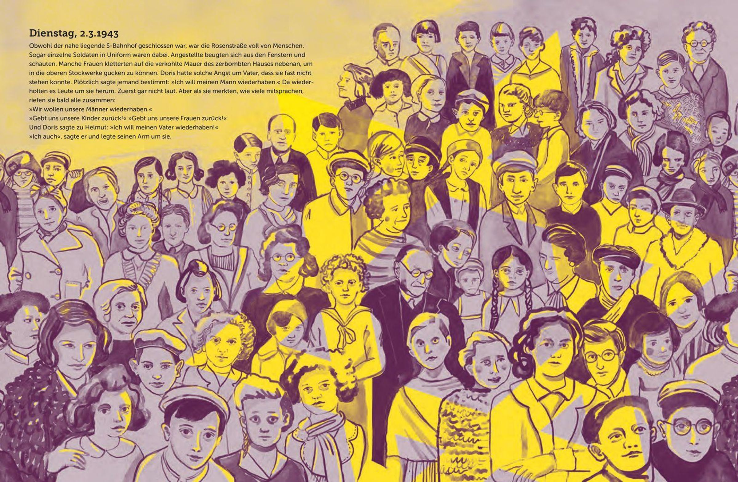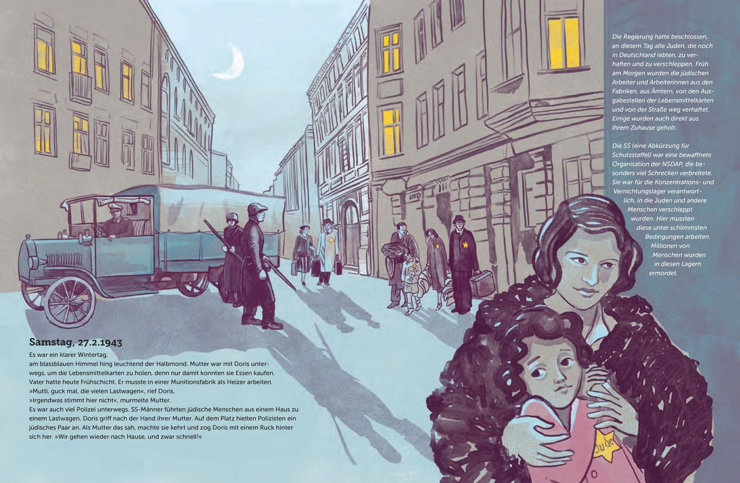 Anja Tuckermann erzählt in diesem Kindersachbuch für Leser*innen ab 10 und Erwachsene eindrucksvoll die Geschichte der kleinen Doris, deren Vater von den Nazis verschleppt wird, und dem Bangen der ganzen Familie, ob sie den Vater wiedersehen werden. Sie erzählt von Doris' Mutter, die zusammen mit vielen anderen Frauen mutig gegen die Inhaftierung protestiert - unter Einsatz ihres Lebens. Mit vielen erklärenden Sachtexten und kunstvoll illustriert von Annabelle von Sperber.