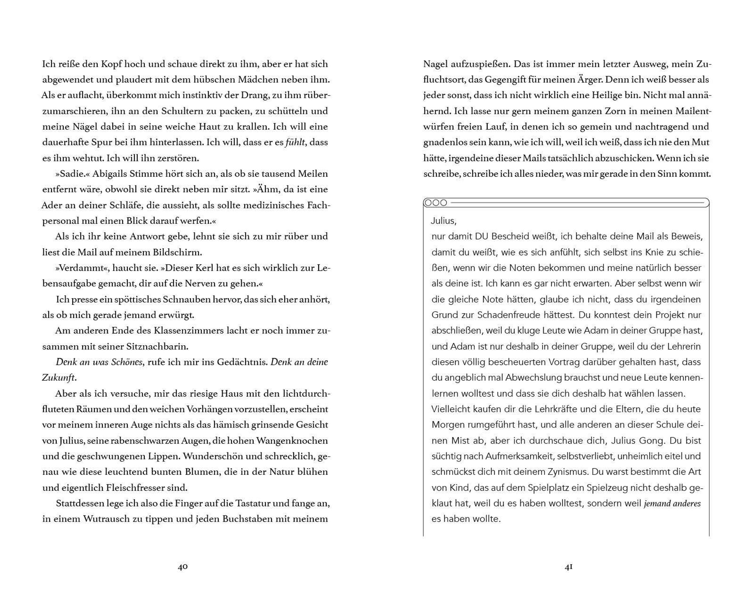Die siebzehnjährige Sadie Wen ist das perfekte Vorzeigemädchen: Schulsprecherin, Klassenbeste, immer höflich. Aber hinter ihrer perfekten Fassade brodelt es - und all der Frust landet in ihren Mail-Entwürfen. Dort teilt sie hemmungslos aus: gegen nervige Lehrkräfte, faule Mitschüler und -schülerinnen und vor allem gegen ihren arroganten Co-Sprecher Julius Gong.