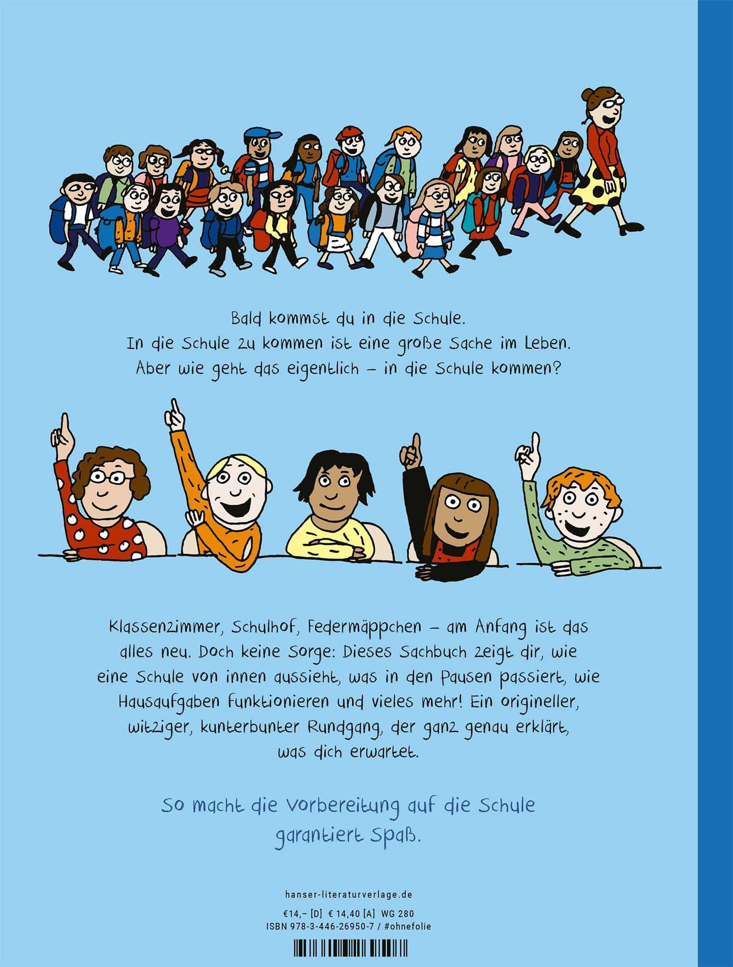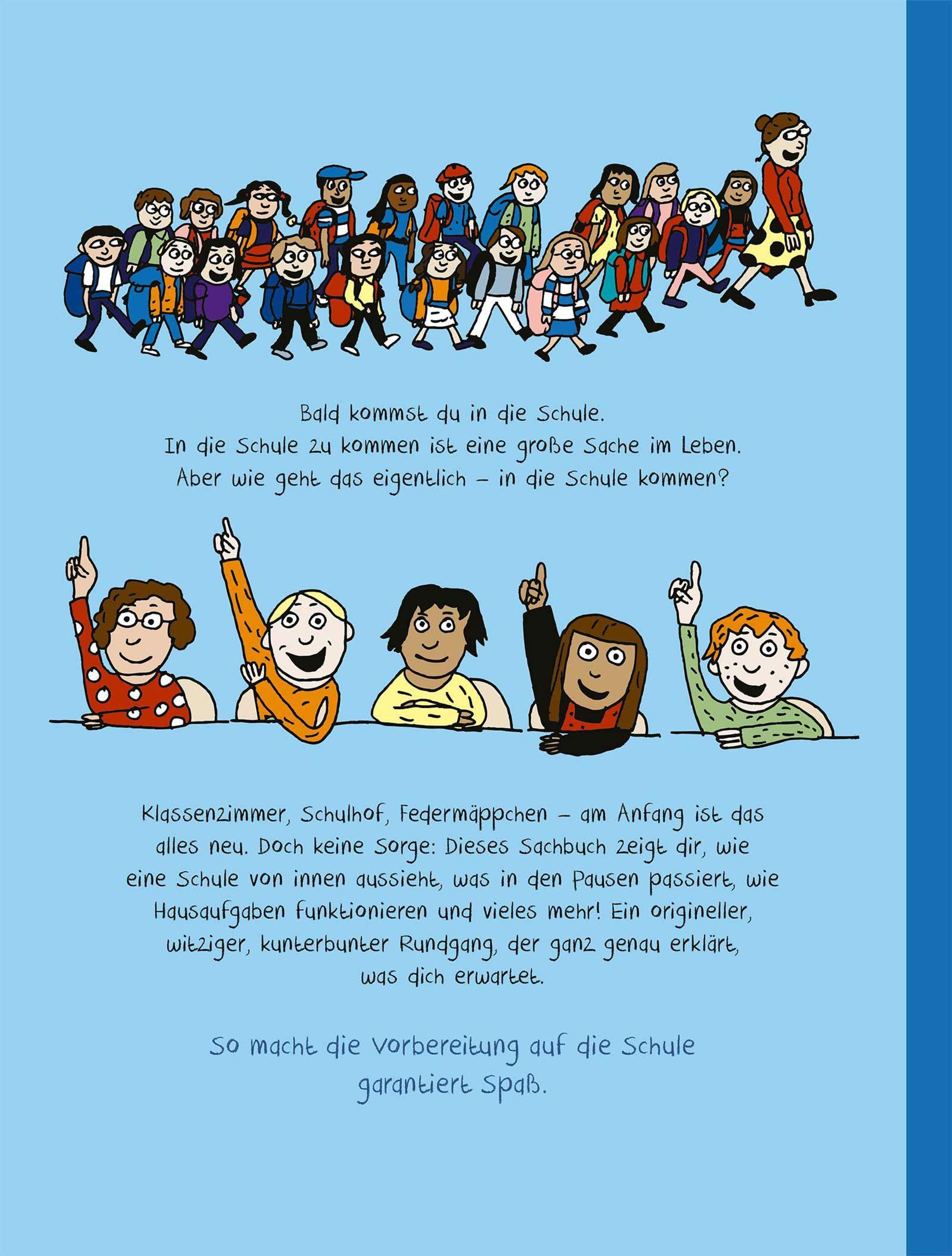 Eine witzige Vorbereitung für alle, die bald mit der Schule beginnen. Der erste Schultag ist ein großes Ereignis, bringt aber auch viele Unsicherheiten mit sich. Was erwartet einen da eigentlich? Was passiert in den Pausen? Und wie funktioniert das mit den Hausaufgaben? Mit ihren unverwechselbaren, humorvollen Illustrationen gibt Anna Fiske Antworten auf die brennendsten Fragen. Sie nimmt die Kinder mit auf einen Rundgang durch Klassenzimmer, Turnhalle und Pausenhof und zeigt alles, was zu einem Schultag dazugehört. Egal ob Schulranzen, Schulweg oder Schulklo, Anna Fiske hat an alles gedacht. Und auch die neuen Freundschaften und der Spaß am Lernen kommen nicht zu kurz. Das macht garantiert jedem Lust auf die Schule!