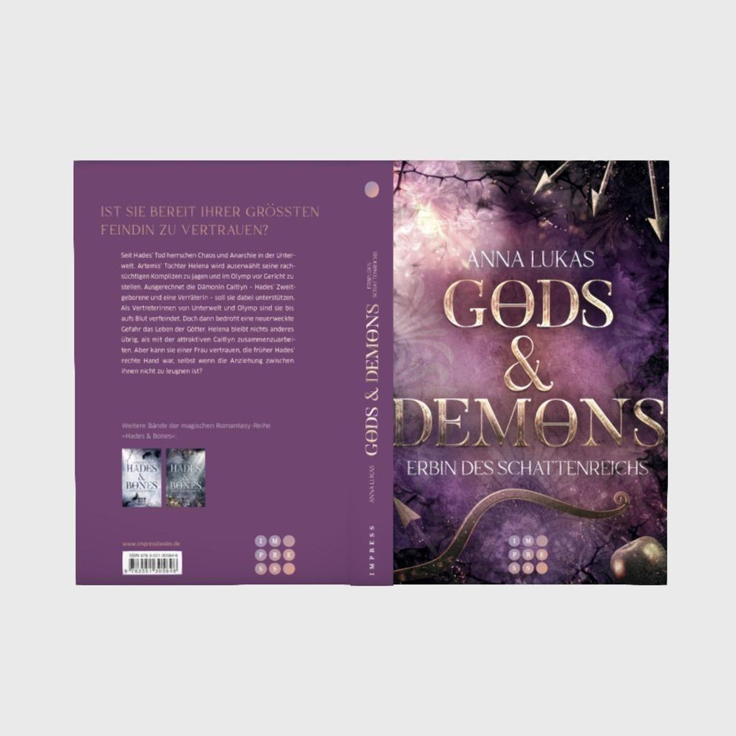 //'Gods & Demons' ist der dritte Band der magischen Romantasy-Reihe 'Hades & Bones' von Anna Lukas. Alle Titel bei Impress:¿