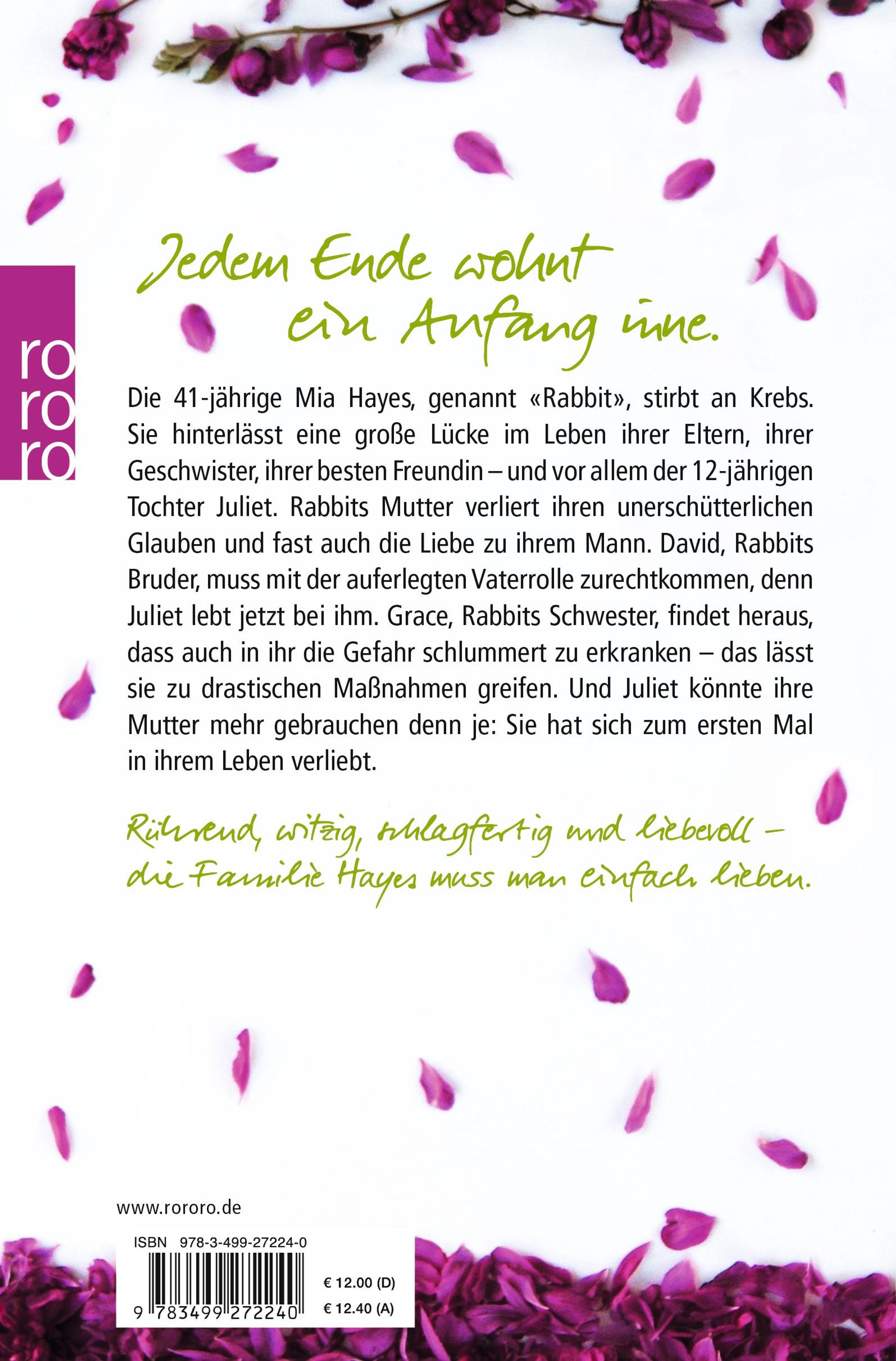 Ein lebensbejahendes Familiendrama von der Autorin des Bestsellers <<Die letzten Tage von Rabbit Hayes>>: Die 41jährige Mia Hayes, genannt <<Rabbit>>, stirbt an Krebs. Sie hinterlässt eine große Lücke im Leben ihrer Eltern, ihrer Geschwister, ihrer besten Freundin - und vor allem der 12jährigen Tochter Juliet. Rabbits Mutter verliert ihren unerschütterlichen Glauben und fast auch die Liebe zu ihrem Mann. David, Rabbits Bruder, muss mit der auferlegten Vaterrolle zurechtkommen, denn Juliet lebt jetzt bei ihm. Grace, Rabbits Schwester, findet heraus, dass auch in ihr die Gefahr schlummert, zu erkranken - das lässt sie zu drastischen Maßnahmen greifen. Und Juliet könnte ihre Mutter mehr gebrauchen denn je: Sie hat sich zum ersten Mal in ihrem Leben verliebt.
