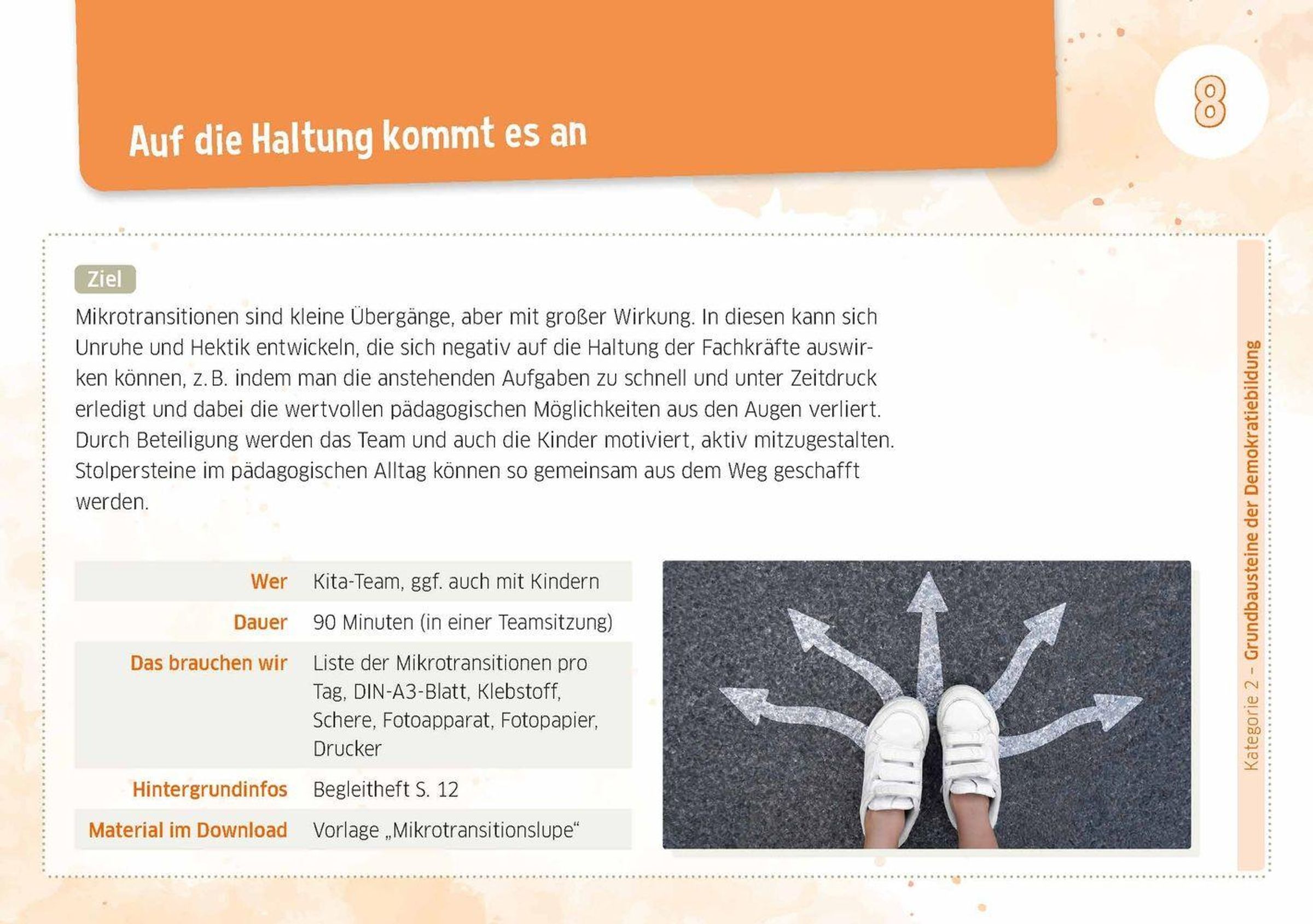 Kartenset mit über 30 Methoden für pädagogische Fachkräfte zur Demokratiebildung in der Kita +++ Demokratiebildung von Anfang an! Kinderrechte und Partizipation müssen für Kinder im Kita-Alter erfahrbar sein, damit diese Aspekte nachhaltig in ihnen wirken können. Von der Gestaltung eines Baums der Demokratie mit den Eltern über das Erzählen und Besprechen von Bilderbuch-Geschichten zum Thema "Demokratie" mit den Kindern - dieses Kartenset hilft Ihnen dabei, Demokratie für alle erlebbar zu machen. Es enthält: