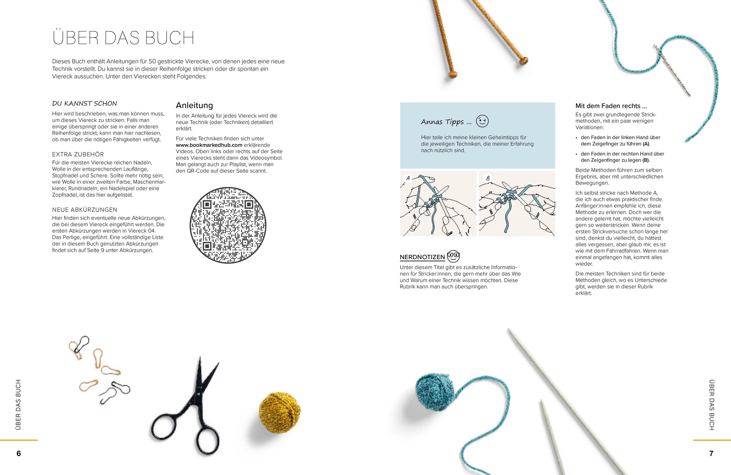 Strickanleitungen mit QR-Videos und Materialtipps: Jedes Quadrat wird durch eine grafische Anleitung, Strickschrift und einen QR-Code zum passenden Video erklärt. Ergänzt wird dies durch Hinweise zur Garnwahl, Nadelstärke und zur Anpassung für Linkshänder.