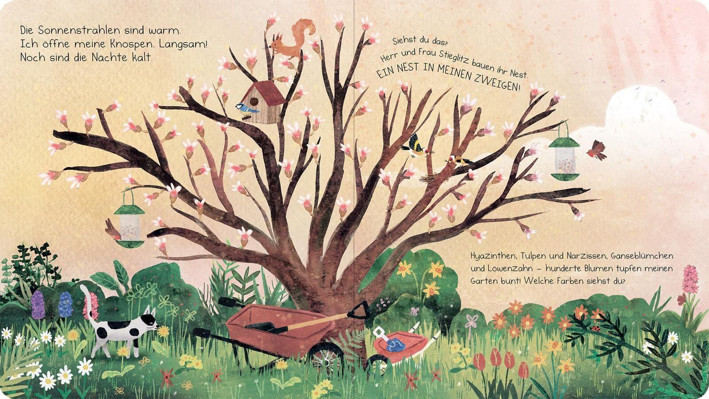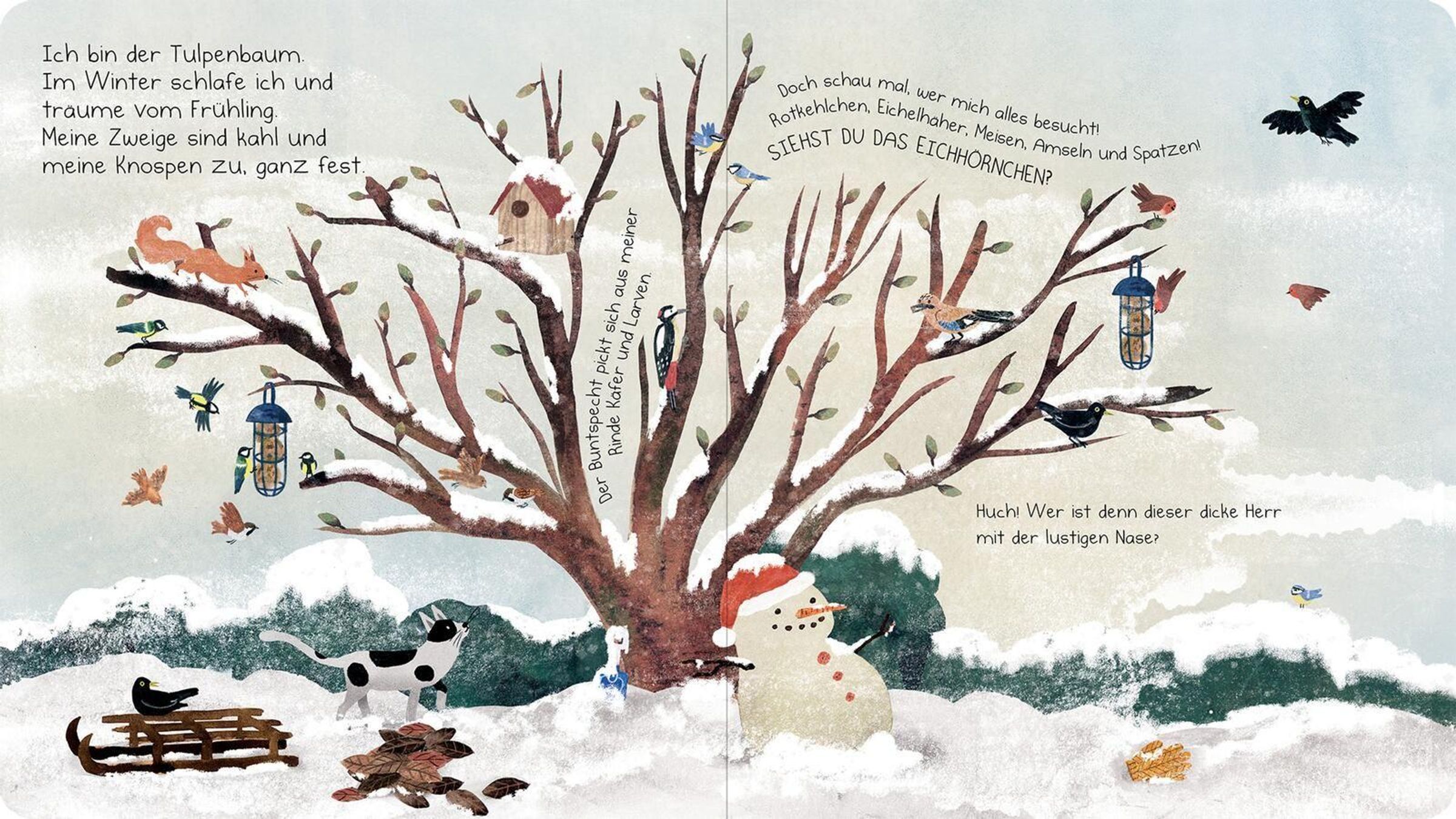 Ich bin der Tulpenbaum. Schau mal, wer mich alles besucht: Rotkehlchen, Meisen, Amseln und sogar ein Eichhörnchen. Im Frühjahr bauen die Stieglitze ihr Nest in meinen Zweigen. Im Sommer spenden meine Blätter Schatten. Im Herbst färbe ich mich bunt und die Zugvögel sammeln sich in meinen Ästen. Im Winter schlafe ich und träume schon vom nächsten Frühling ... Ein poetisches Pappbilderbuch über den Zauber der Jahreszeiten und die kleinen Wunder der Natur.