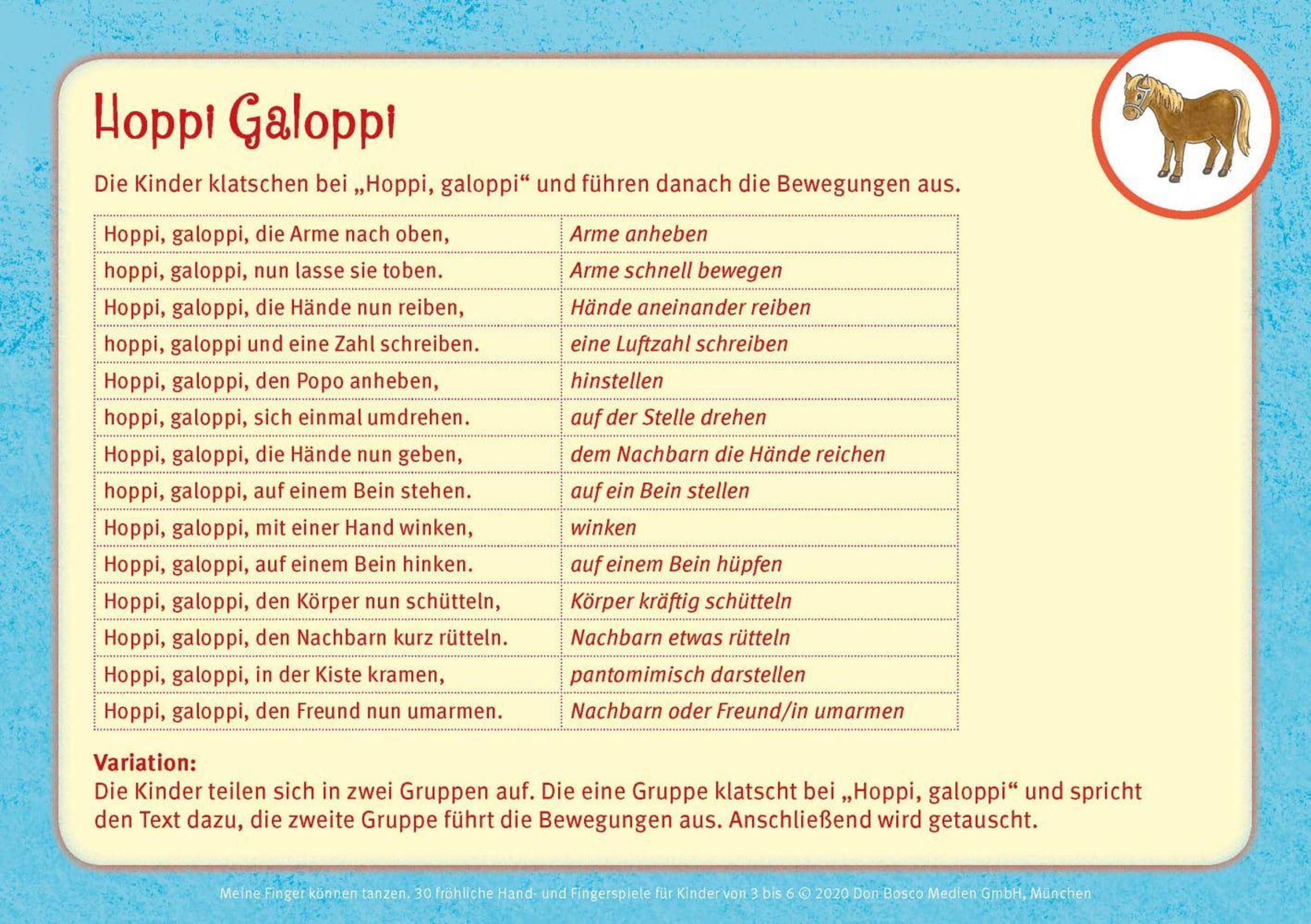 - Dank vieler lautmalerischer Ausdrücke ("Hoppi, galoppi") begreifen Kinder intuitiv das Spiel und machen gerne mit