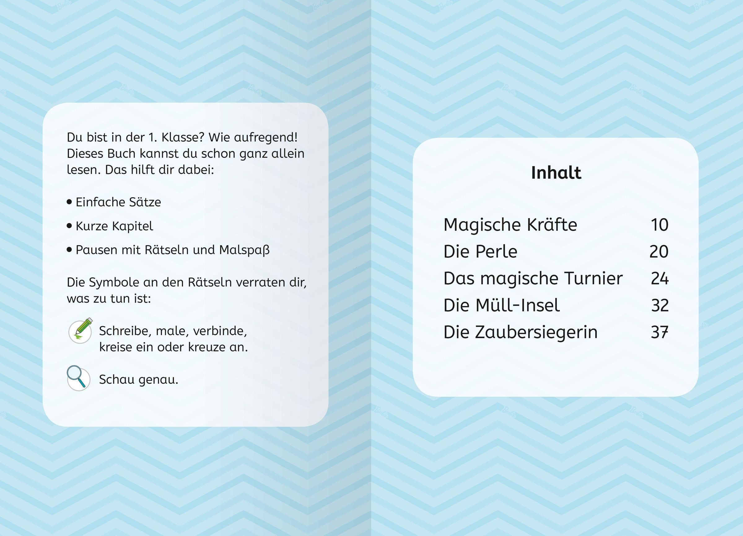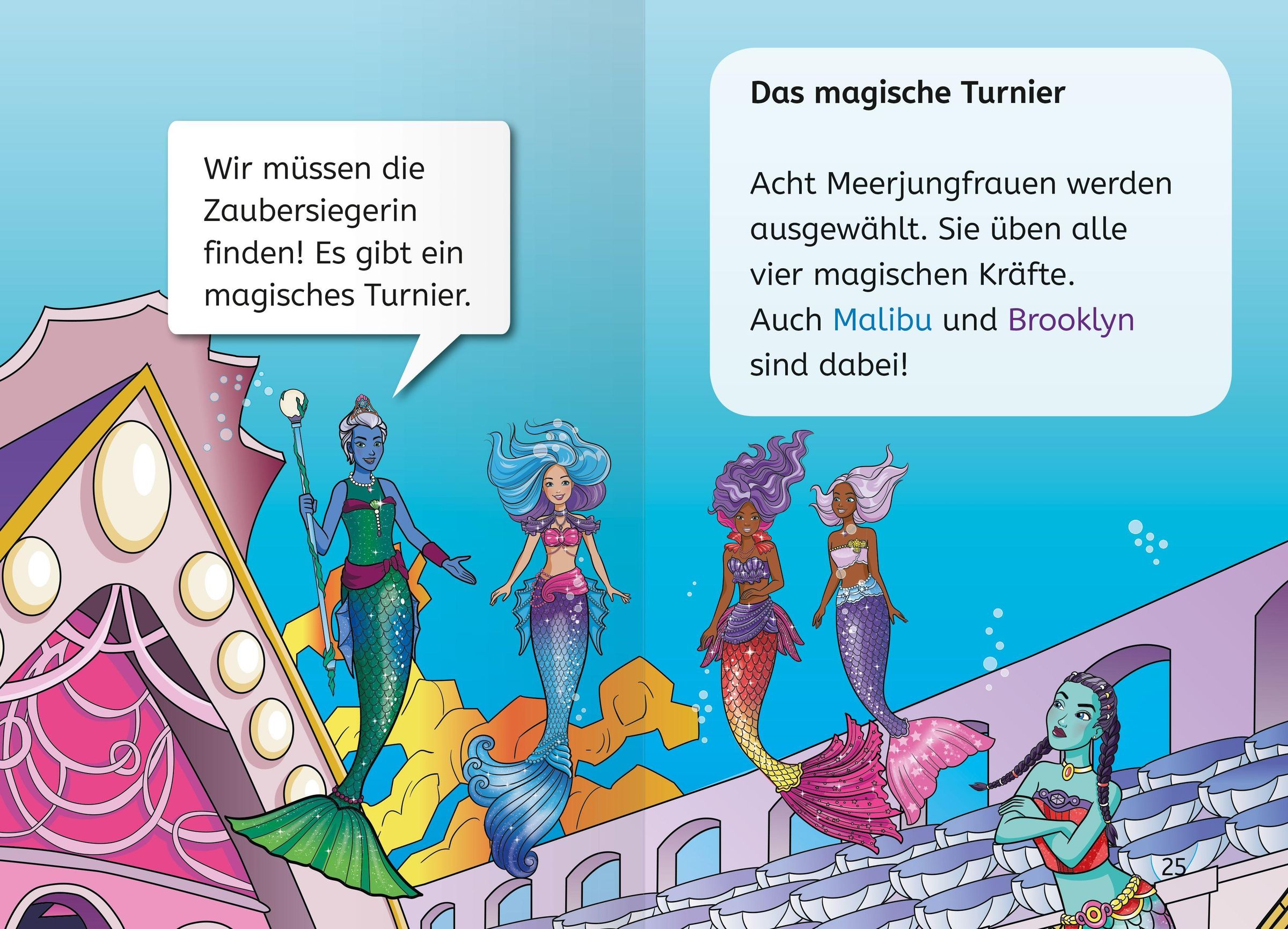 Barbie Malibu und Barbie Brooklyn nehmen als Meerjungfrauen an einer magischen Prüfung unter Wasser teil. Dort wird getestet, welche Meerjungfrau alle vier magischen Kräfte besitzt: Wasser, Luft, Erde und Feuer. Wer wird als Zaubersiegerin hervorgehen? Ein spannendes Unterwasser-Abenteuer zum Lesenlernen mit Barbie als Meerjungfrau.