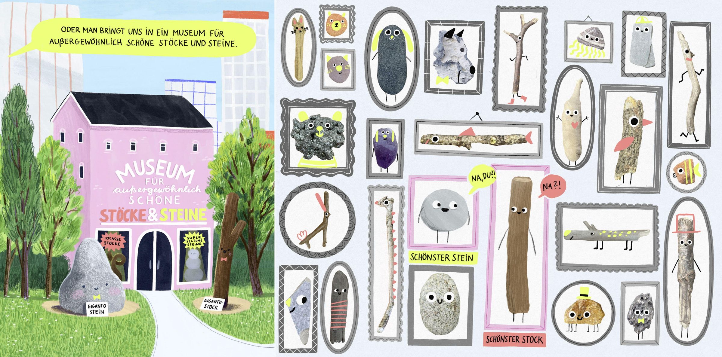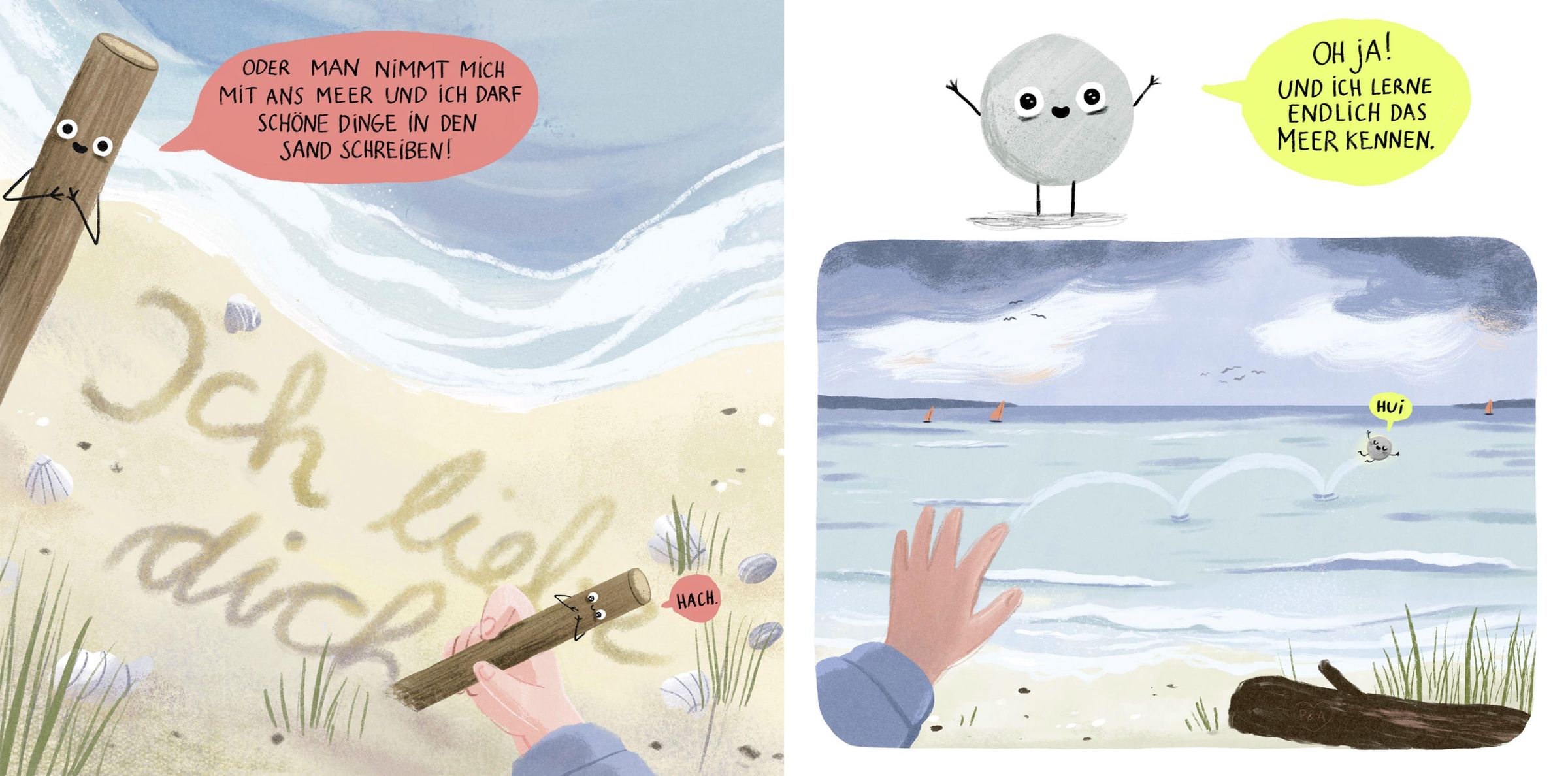 "Stock & Stein" von Anne-Kathrin Behl. Ein Stock, ein Stein mit Marienkäfer inmitten bunter Blumen., Buch