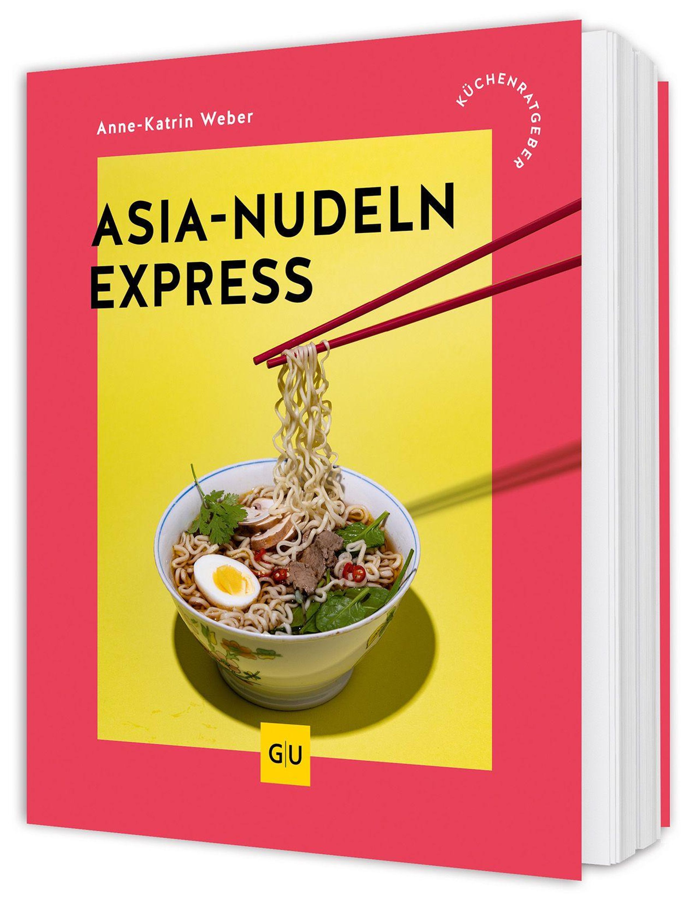 "Asia-Nudeln Express", Anne-Katrin Weber, KÜCHENRATGEBER. Illustration mit Nudelschüssel und roten Stäbchen., Buch