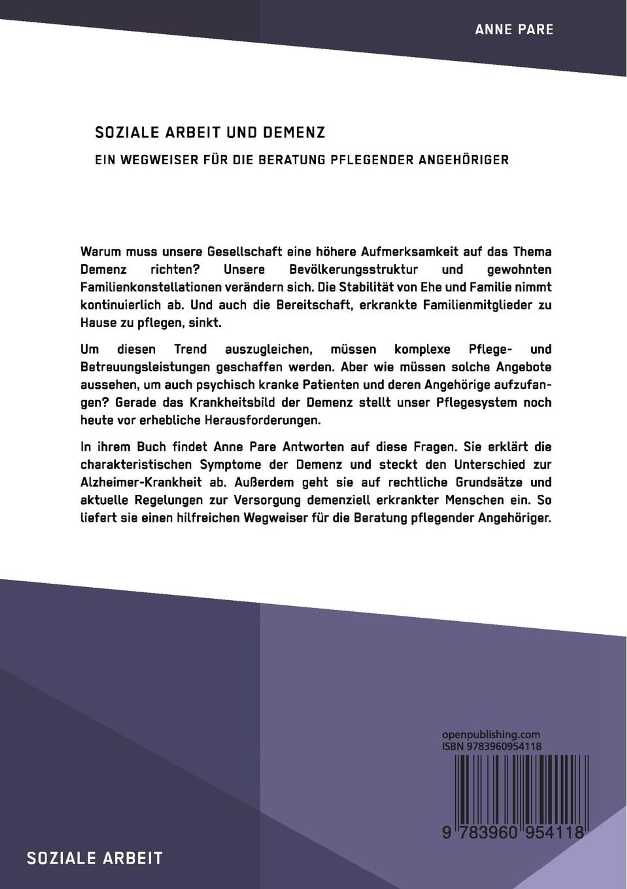 In ihrem Buch findet Anne Pare Antworten auf diese Fragen. Sie erklärt die charakteristischen Symptome der Demenz und steckt den Unterschied zur Alzheimer-Krankheit ab. Außerdem geht sie auf rechtliche Grundsätze und aktuelle Regelungen zur Versorgung demenziell erkrankter Menschen ein. So liefert sie einen hilfreichen Wegweiser für die Beratung pflegender Angehöriger.