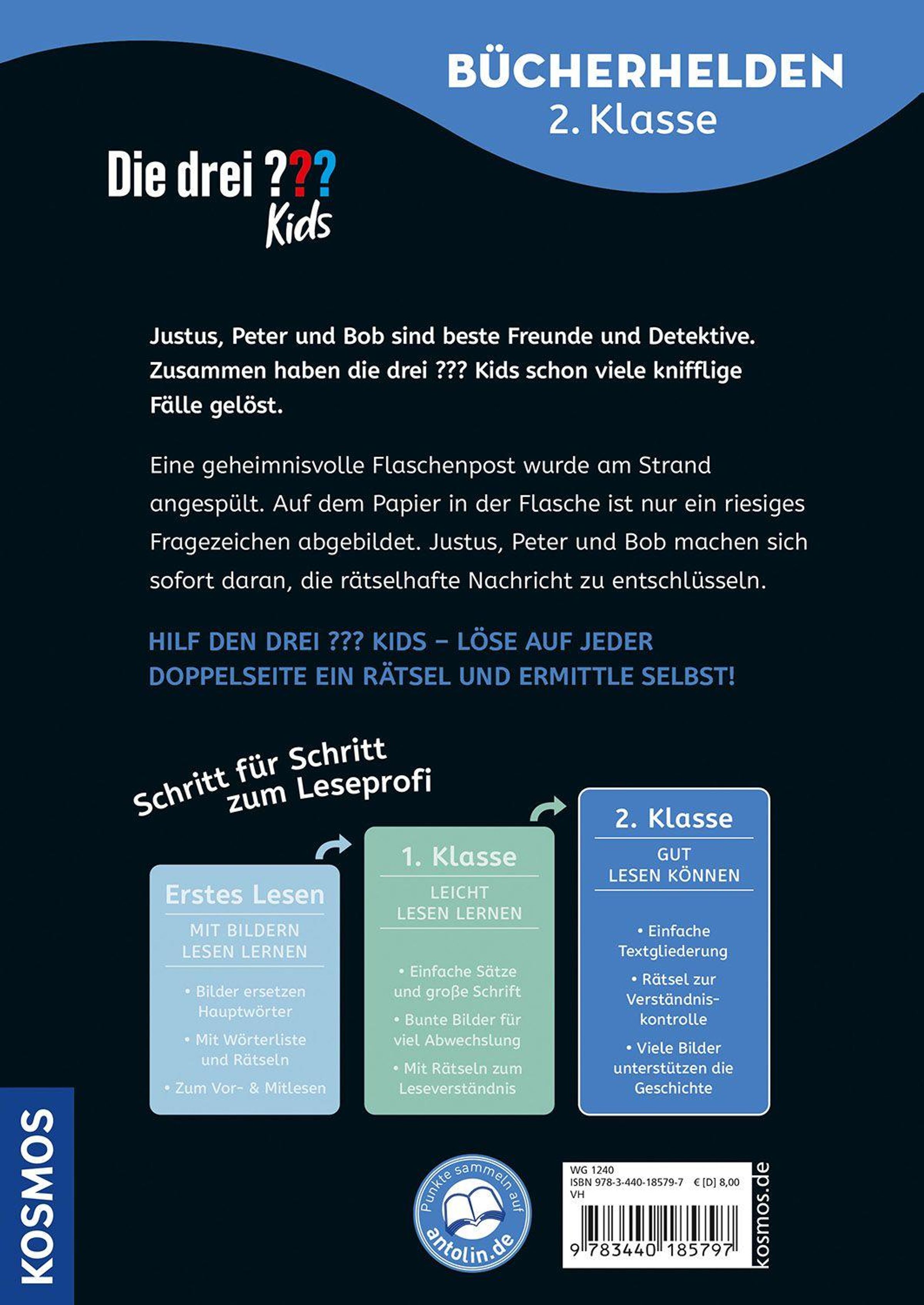 Justus, Peter und Bob sind beste Freunde und Detektive! Zusammen haben die drei ??? schon viele knifflige Fälle gelöst. Die drei ??? Kids staunen: Am Strand wurde eine geheimnisvolle Flaschenpost angespült. Auf dem Papier in der Flasche ist nichts weiter abgebildet als ein riesiges Fragezeichen! Eine rätselhaftere Botschaft können sich Justus, Peter und Bob kaum vorstellen. Doch schon bald stehen sie vor weiteren Fragen ... Lesen lernen ist schwer? Nicht mit diesem spannenden Krimi zum Mitraten, die auch Leseanfänger ab Klassenstufe 2 leicht bewältigen können. Illustrationen und ein Detektiv-Rätsel auf jeder Doppelseite machen den Band abwechslungsreich, sorgen für Erfolgserlebnisse und erhöhen die Lese-Motivation. So macht der Einstieg ins selbstständige Bücherlesen einfach Spaß.