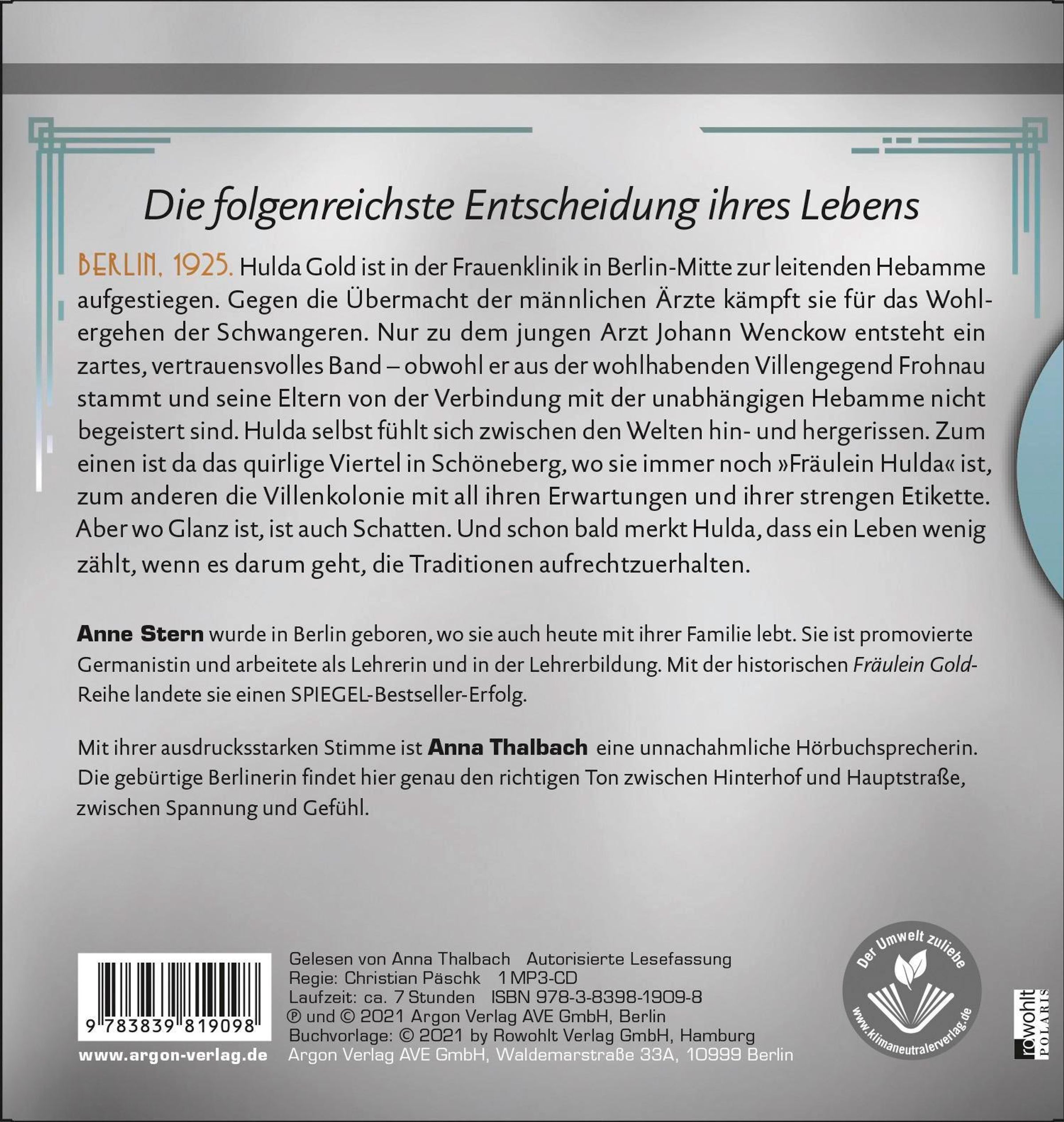 Berlin, 1925. Hulda Gold ist in der neuen Frauenklinik in Berlin-Mitte zur leitenden Hebamme aufgestiegen. Nachdem sie die komplizierte Liaison mit Karl North beendet hat, verliebt sie sich in den jungen Arzt Johann Wenckow, der im wohlhabenden Frohnau wohnt. Trotz des Missfallens seiner Eltern vertiefen die beiden ihre Beziehung. Doch Hulda fühlt sich zwischen den Welten zerrissen, in denen sie von nun an ein und aus geht: dem quirligen Schöneberg, wo sie immer noch >>Fräulein Hulda<< ist, und der reichen Villenkolonie, in der sie sich nach wie vor fremd fühlt. Bei einem Ball im Dunstkreis der Familie Wenckow stößt Hulda auf ein streng gehütetes Familiengeheimnis, das sie in die Berliner Kunstwelt führt und ihre Beziehung zu Johann erschüttert ...