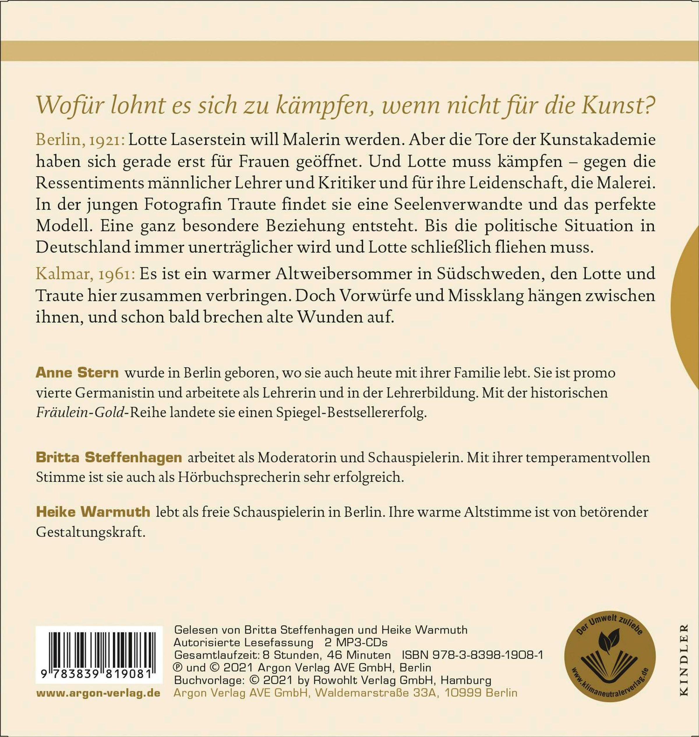Berlin, 1921. Lotte Laserstein will Malerin werden. Aber die Tore der Kunstakademie haben sich für Frauen gerade erst geöffnet. Und Lotte muss kämpfen - gegen die Ressentiments männlicher Lehrer und Kritiker und für ihre Leidenschaft, die Malerei. In der jungen Fotografin Traute findet sie eine Seelenverwandte und das perfekte Modell. Eine ganz besondere Beziehung entsteht. Bis die politische Situation in Deutschland für Juden immer unerträglicher wird und Lotte schließlich fliehen muss.