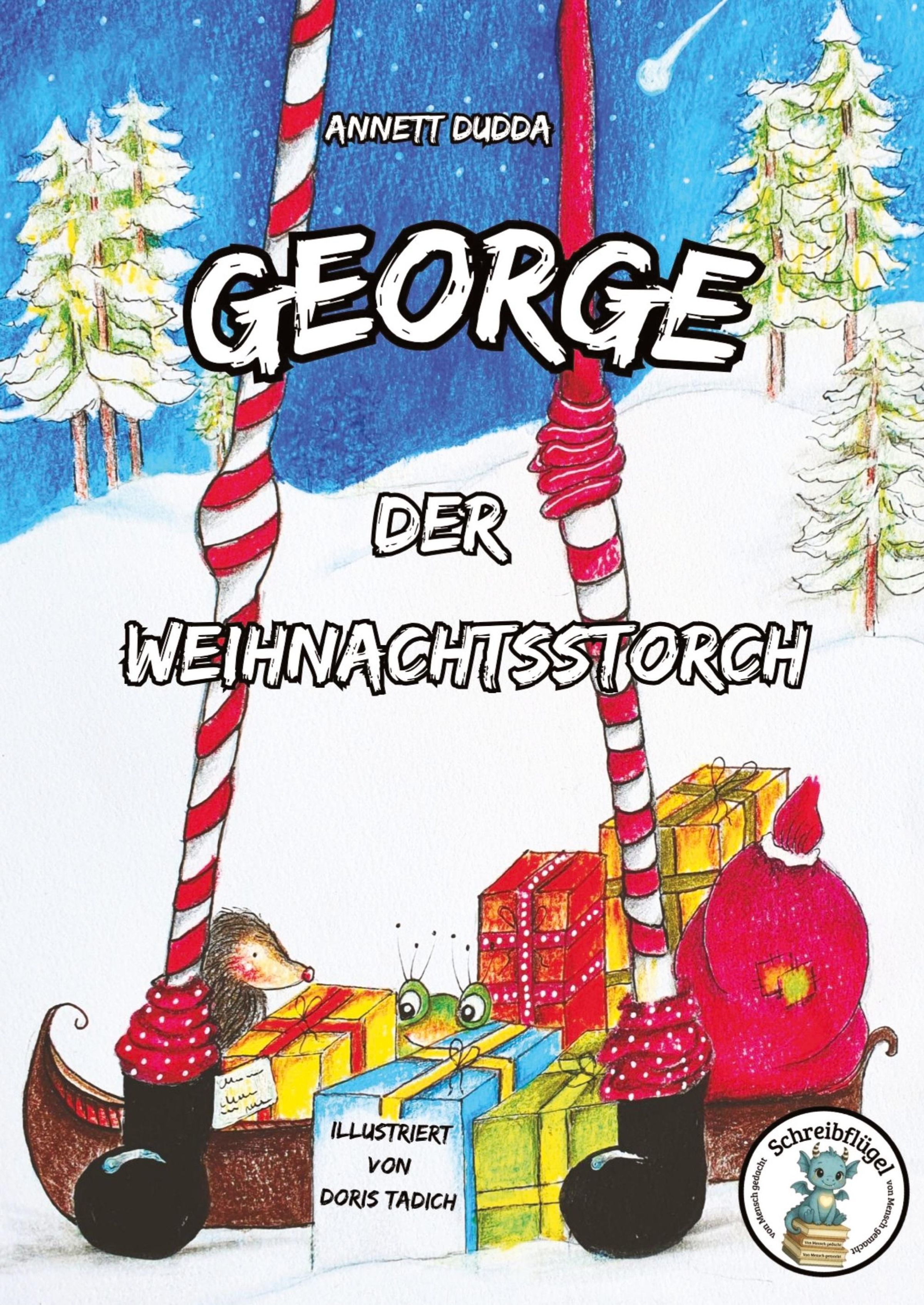 "Annett Dudda - George der Weihnachtsstorch - illustriert von Doris Tadich" in großer Schrift. Illustration mit Geschenkpaketen, Tieren und schneebedeckten Bäumen., Buch