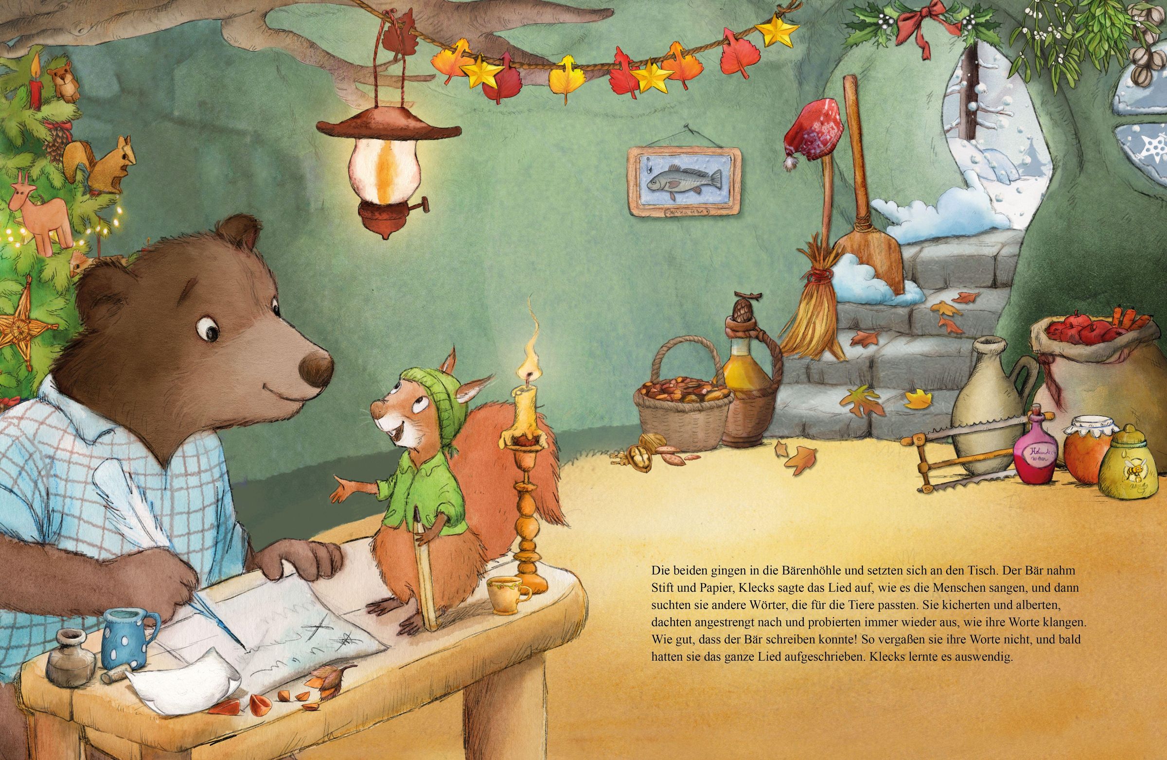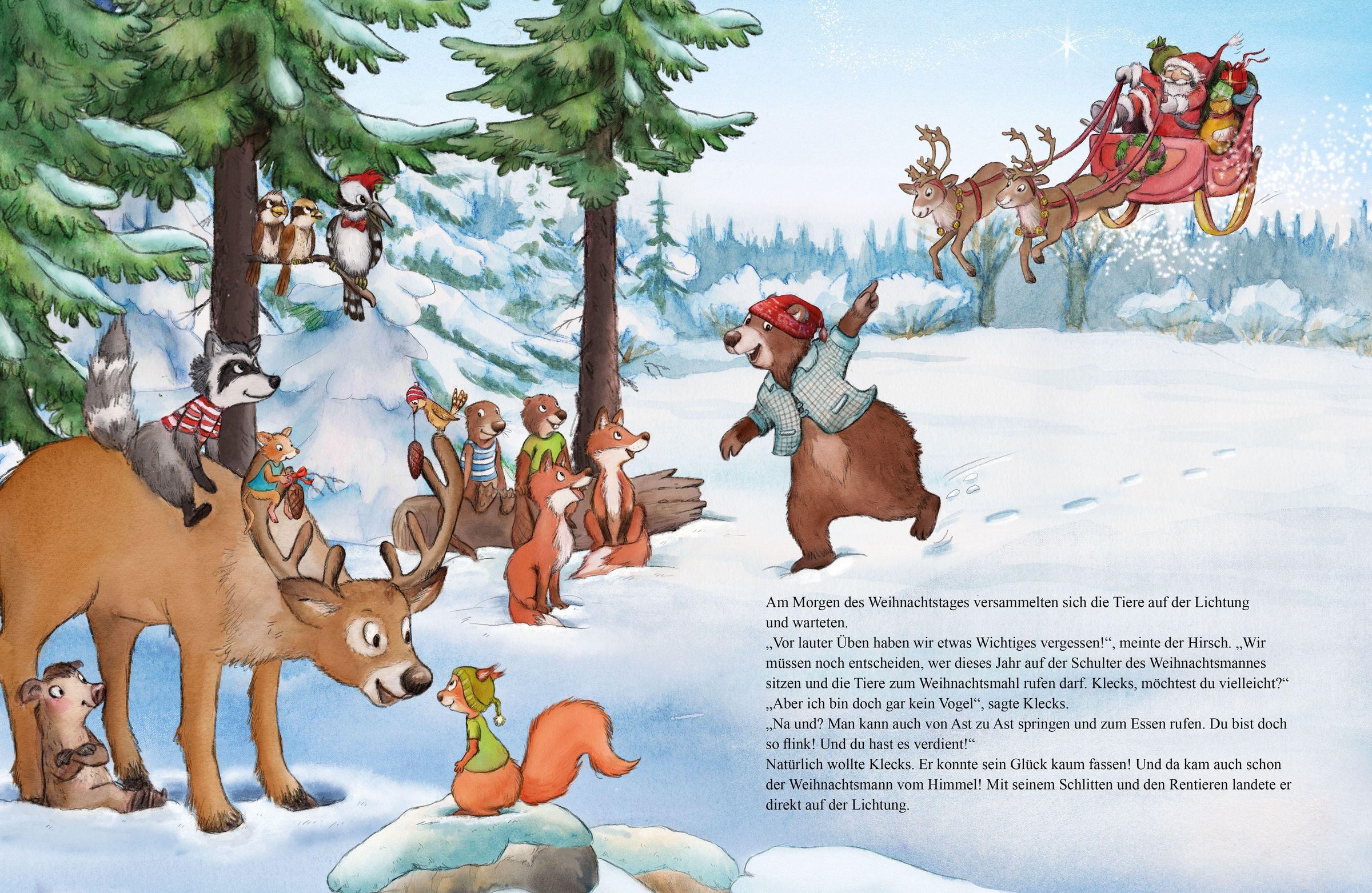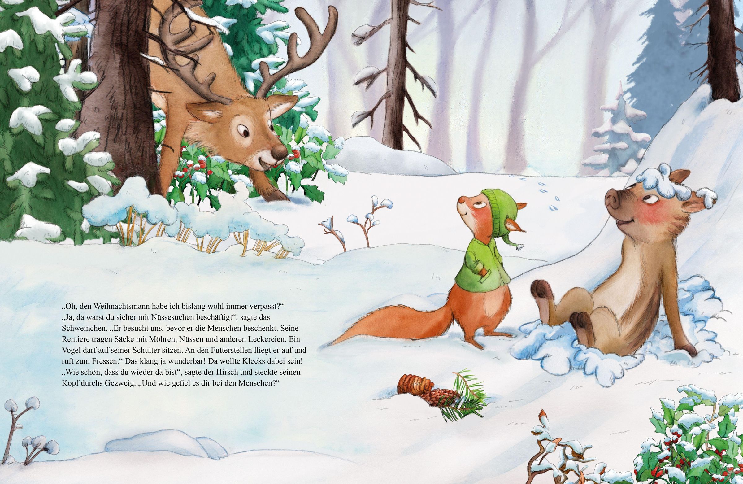Als der erste Schnee fällt, freuen sich alle Waldtiere auf das Weihnachtsfest und die Bescherung. Da erzählt Eichhörnchen Klecks, was es bei den Menschen erlebt hat: Anders als die Tiere bereiten Menschenkinder dem Weihnachtsmann eine kleine Überraschung. Das finden die Tiere so schön, dass sie beschließen, dem Weihnachtsmann etwas ganz Besonderes zu schenken. Doch worüber würde sich der Weihnachtsmann wohl am meisten freuen?