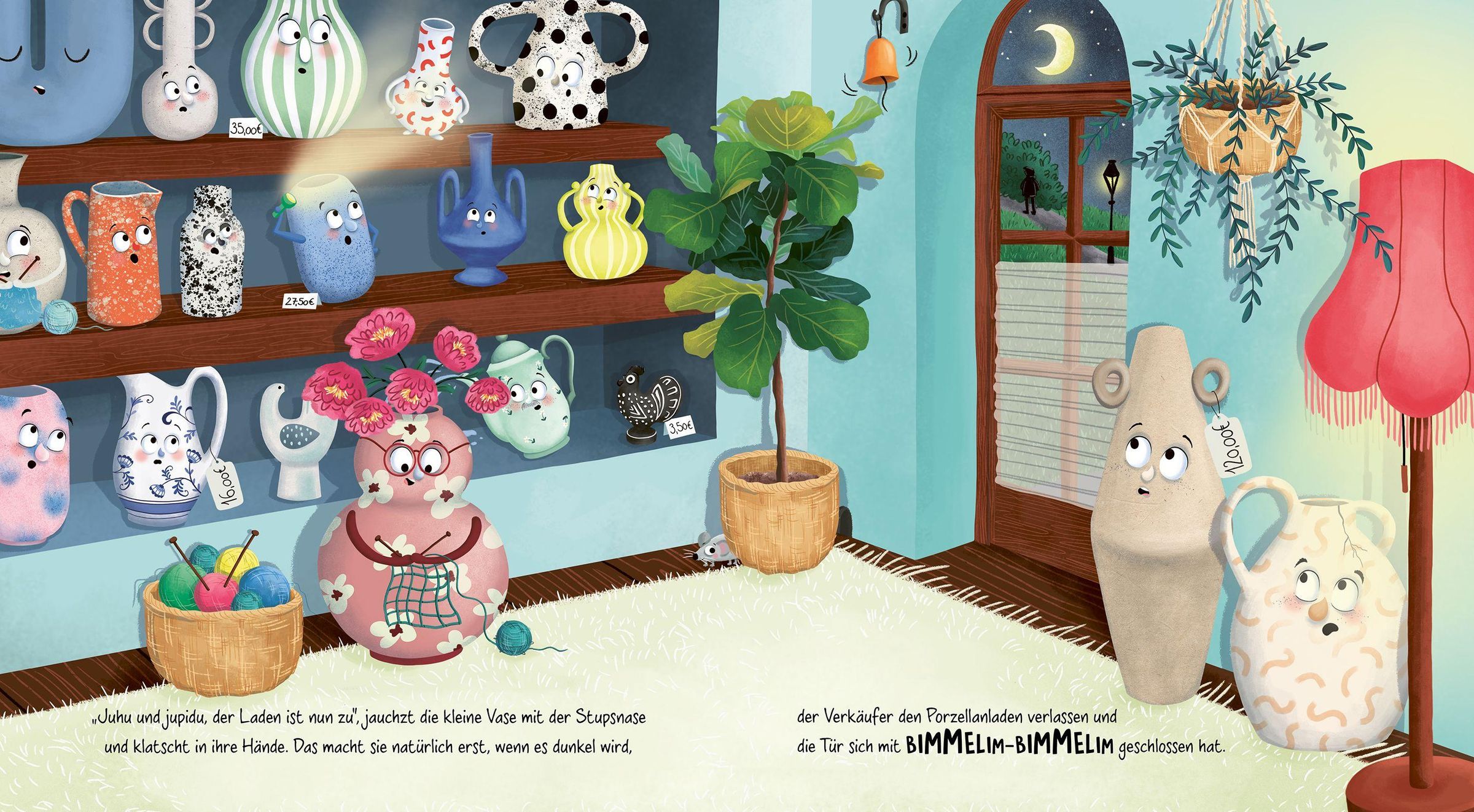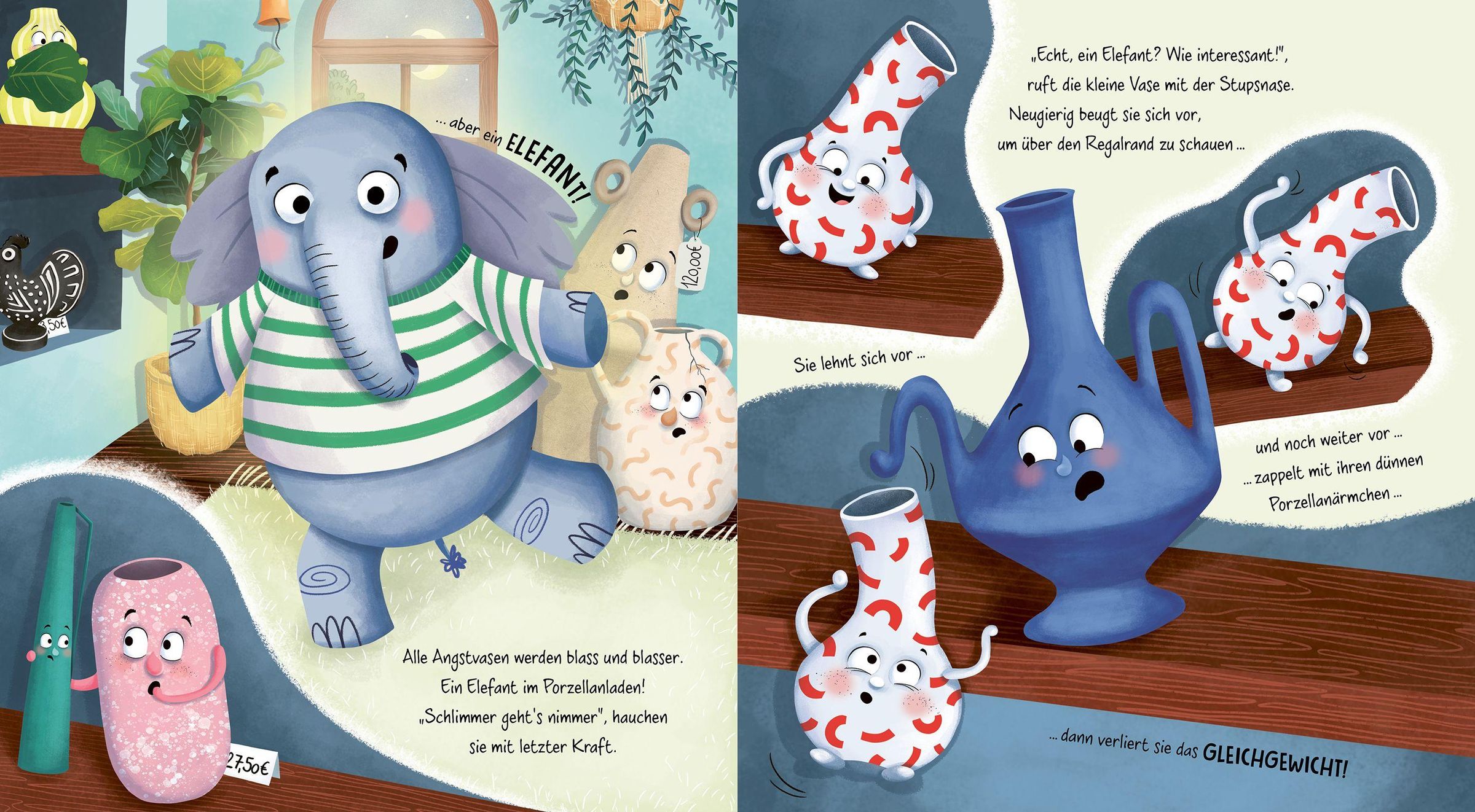 Nachts im Porzellanladen erwachen die Vasen zum Leben. Sie stricken, tauschen Geschichten aus und haben, bis auf die kleine Vase, fürchterliche Angst - vor dem Sturz vom Regalbrett, vor dem Umfallen und vor allem, was ihr Dasein erschüttern könnte. Doch was passiert, wenn ein Elefant in den Porzellanladen kommt und das Leben aller Angstvasen auf den Kopf stellt?