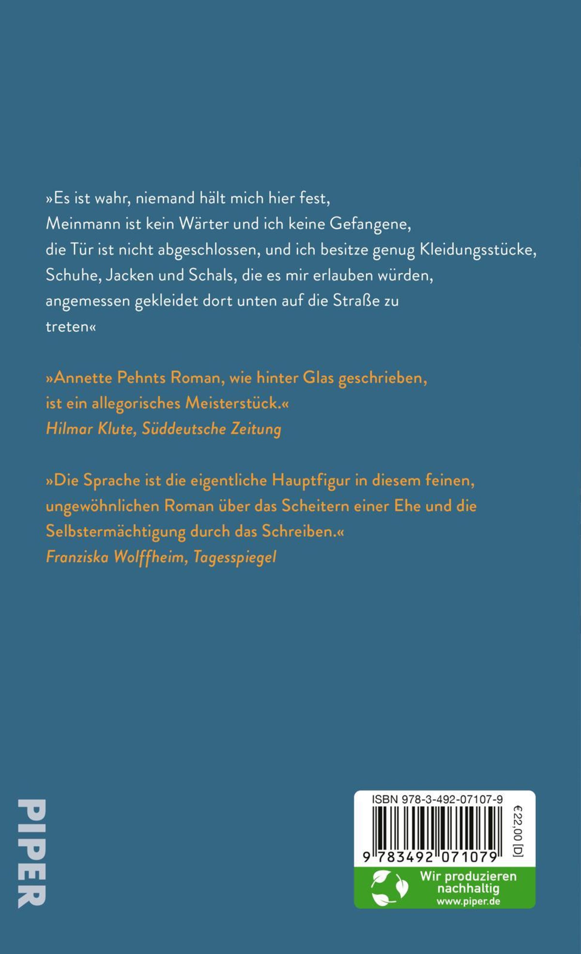 'Annette Pehnts Roman, wie hinter Glas geschrieben, ist ein allegorisches Meisterstück.' Hilmar Klute, Süddeutsche Zeitung