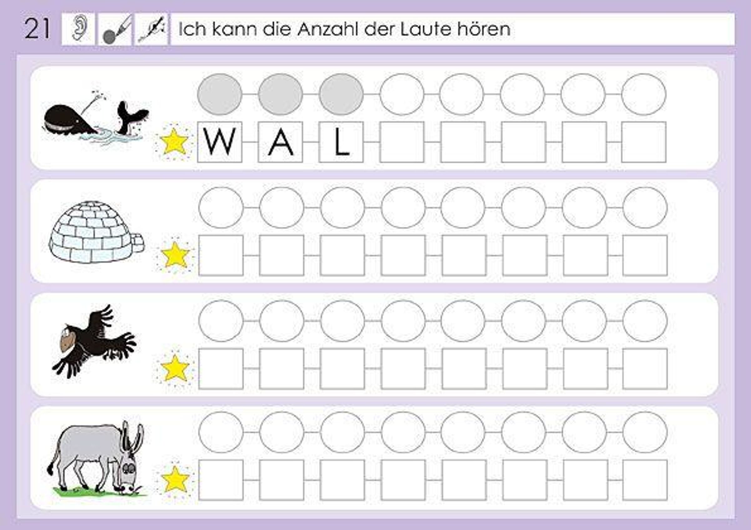 Inhalt: Gleiche Anlaute hören und Bildwörter Anlauten zuordnen - Anzahl der Laute hören - Bildwörter den Anlautbuchstaben zuordnen - Anlautbuchstaben aufschreiben - Anlaute finden und aufschreiben. 56 farbige Seiten, Format A5.