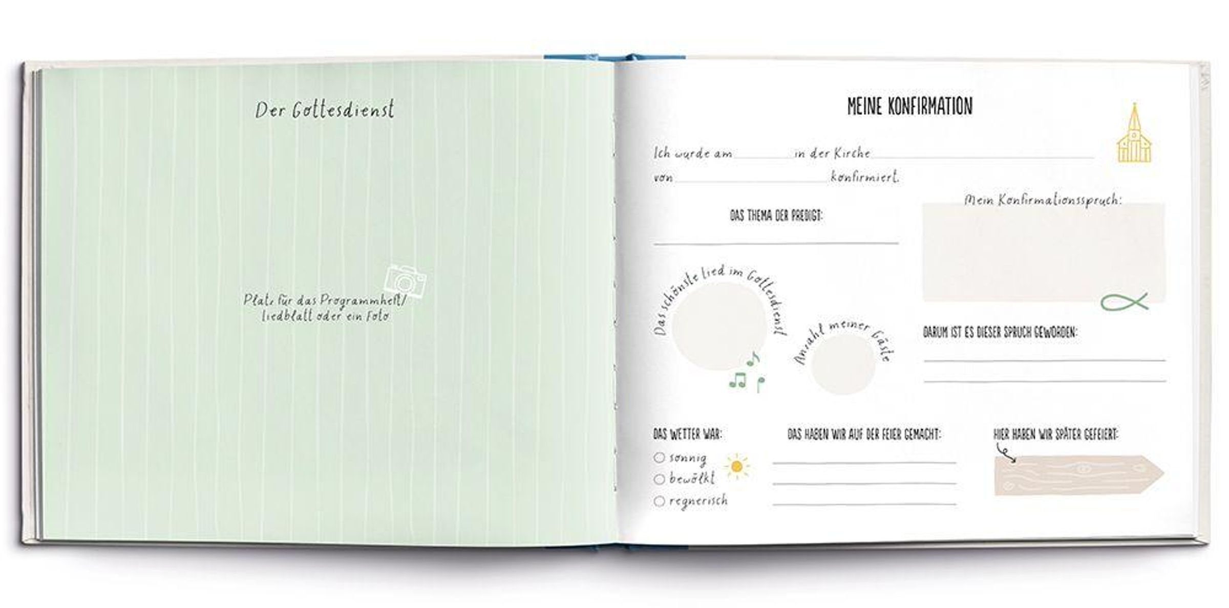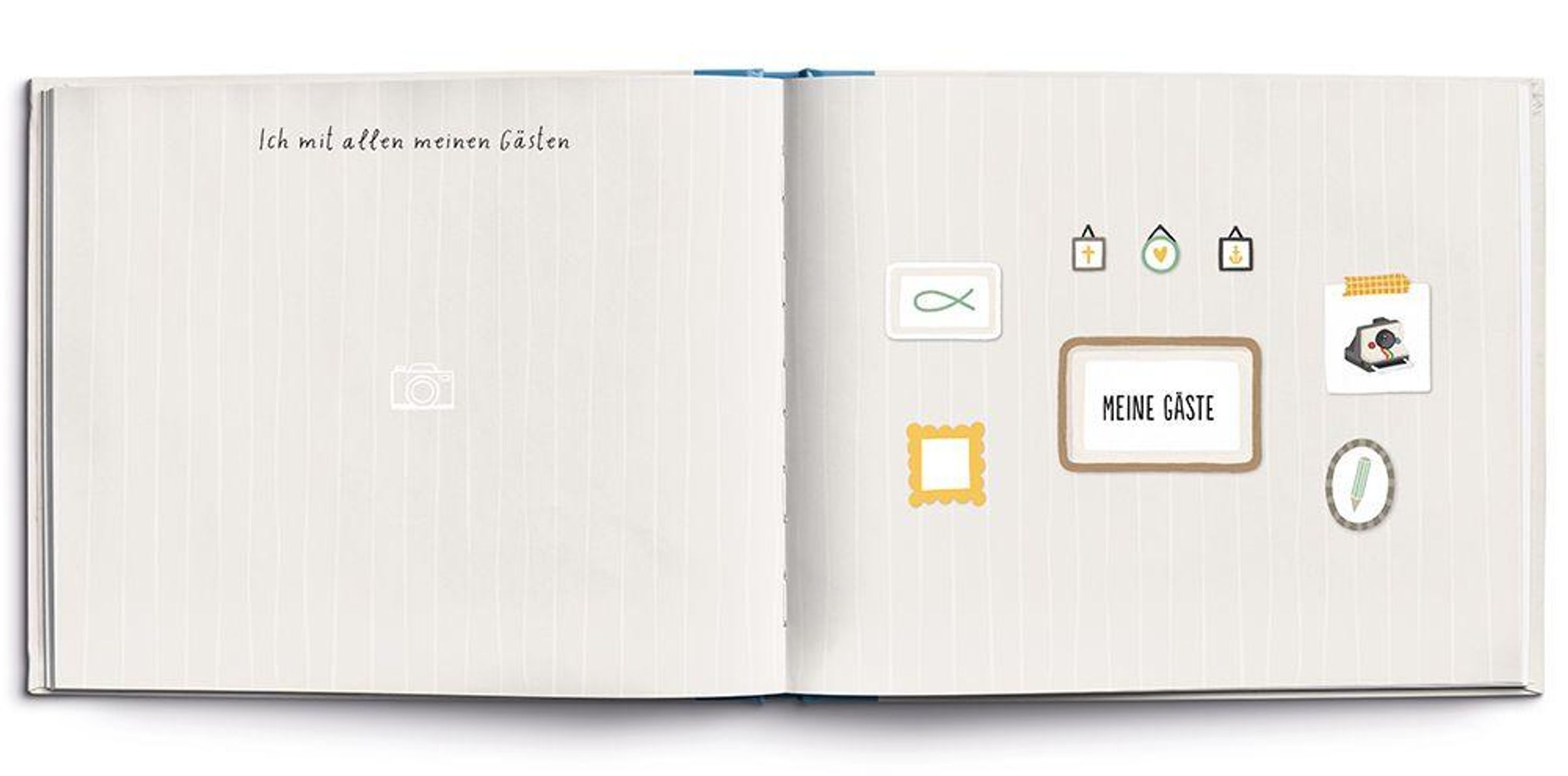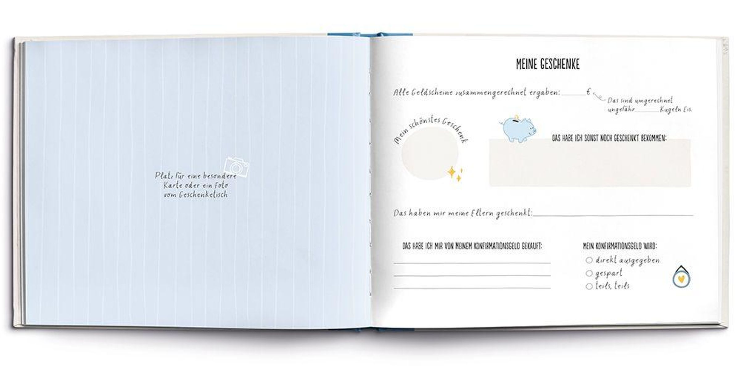 Es hält die schönsten Momente rund um die Konfirmation fest - vom Konfirmandenunterricht über den Gottesdienst bis hin zur Feier, den Gästen und Geschenken. Der Konfirmand kann selbst Fragen beantworten, Fotos einkleben und besondere Erlebnisse notieren. Für bis zu 30 Gäste gibt es Doppelseiten mit originellen und abwechslungsreichen Fragen - passend zum Tag. Zusätzlich gibt es auch Seiten mit ausreichend Platz für Fotos und längere Glückwünsche. In den Tagesstatistiken kann anschließend ausgewertet werden, wie viele Kuchenstücke verputzt wurden und eine Landkarte zeigt, von wo die Gäste angereist sind.