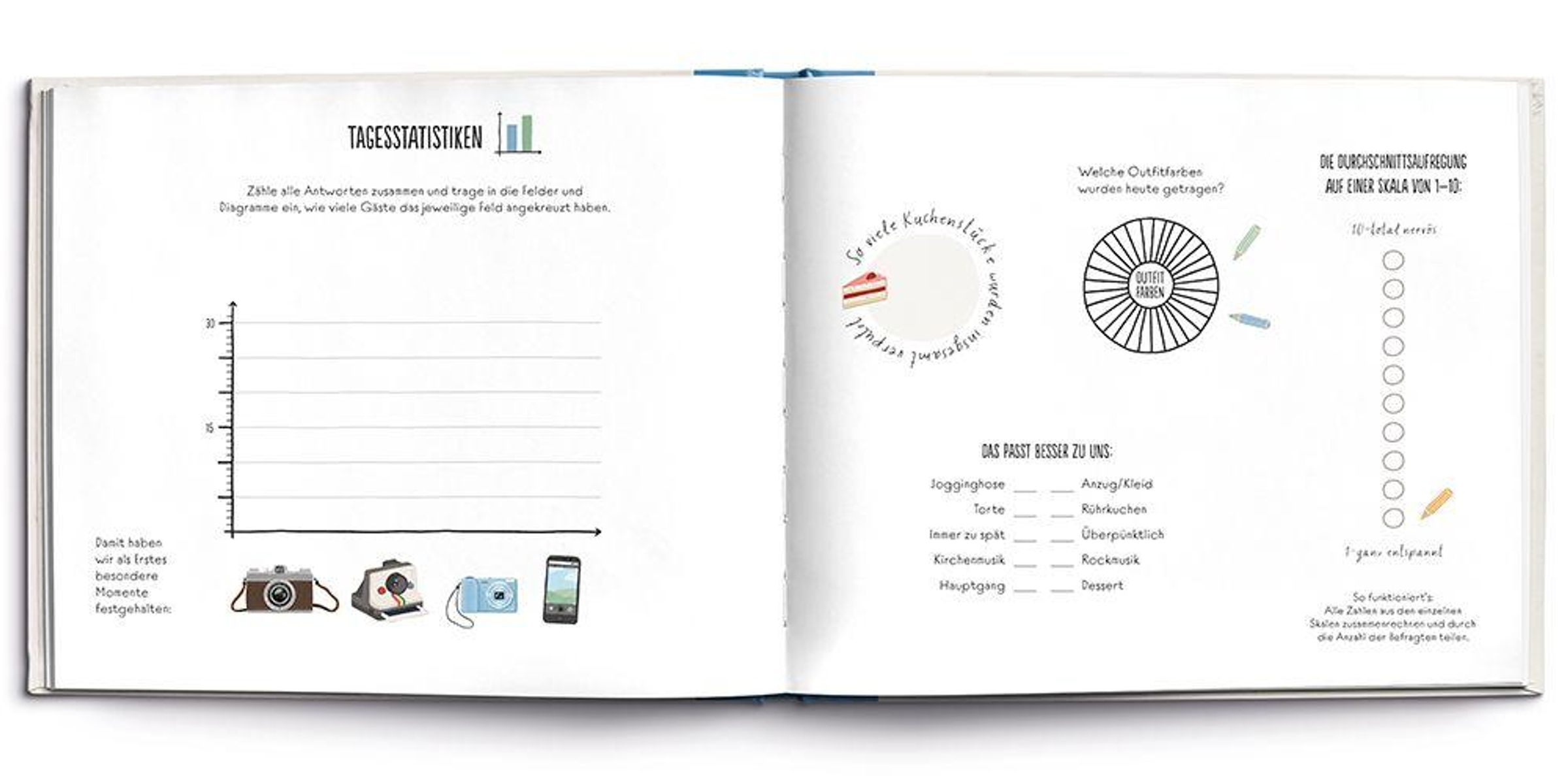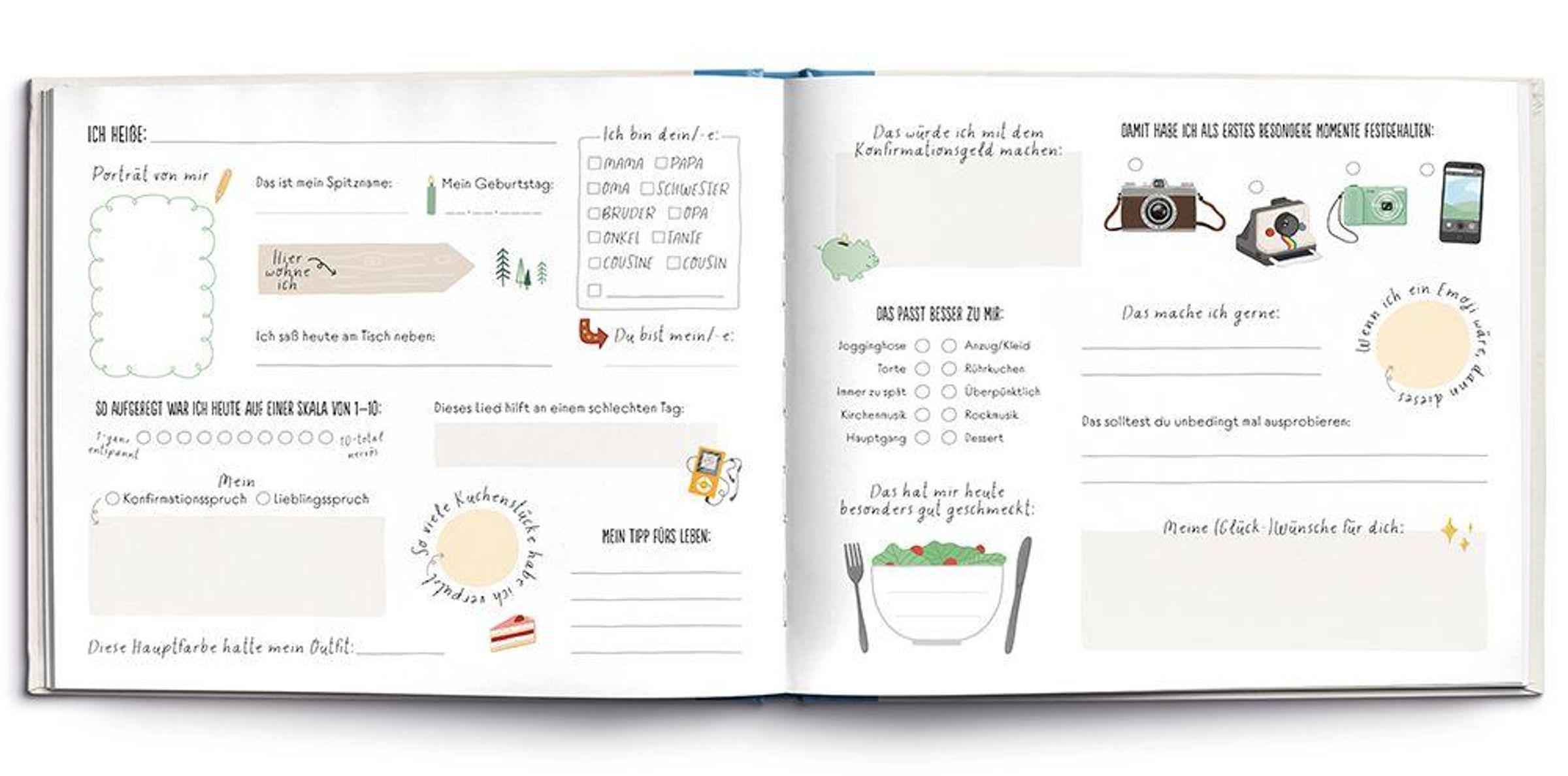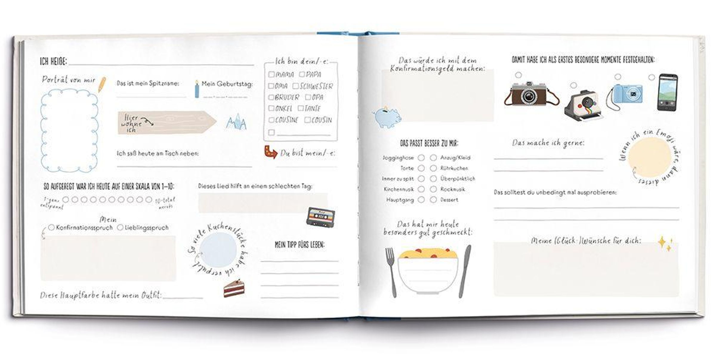 Es hält die schönsten Momente rund um die Konfirmation fest - vom Konfirmandenunterricht über den Gottesdienst bis hin zur Feier, den Gästen und Geschenken. Der Konfirmand kann selbst Fragen beantworten, Fotos einkleben und besondere Erlebnisse notieren. Für bis zu 30 Gäste gibt es Doppelseiten mit originellen und abwechslungsreichen Fragen - passend zum Tag. Zusätzlich gibt es auch Seiten mit ausreichend Platz für Fotos und längere Glückwünsche. In den Tagesstatistiken kann anschließend ausgewertet werden, wie viele Kuchenstücke verputzt wurden und eine Landkarte zeigt, von wo die Gäste angereist sind.