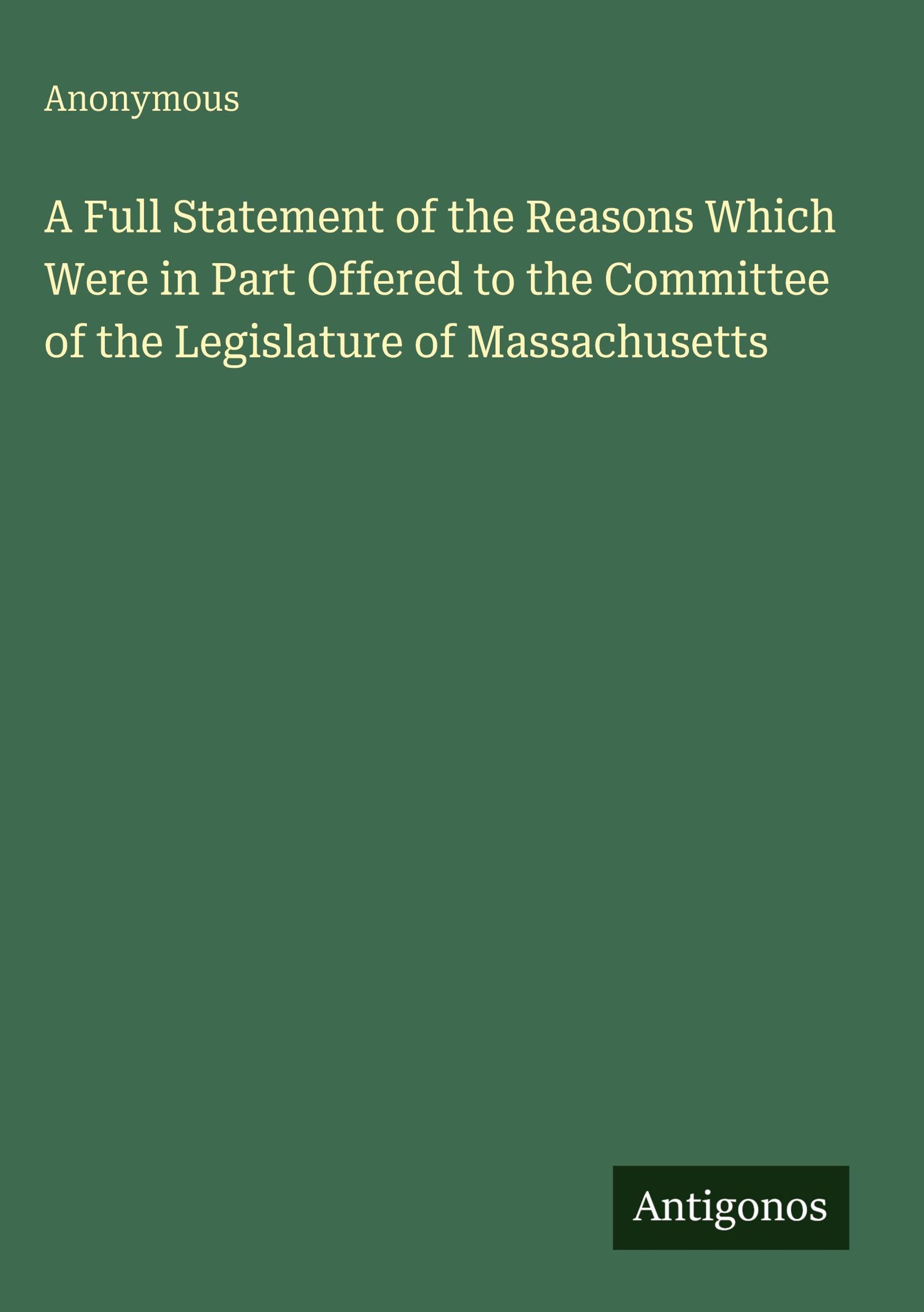 A Full Statement of the Reasons Which Were in Part Offered to the Committee of the Legislature of Massachusetts