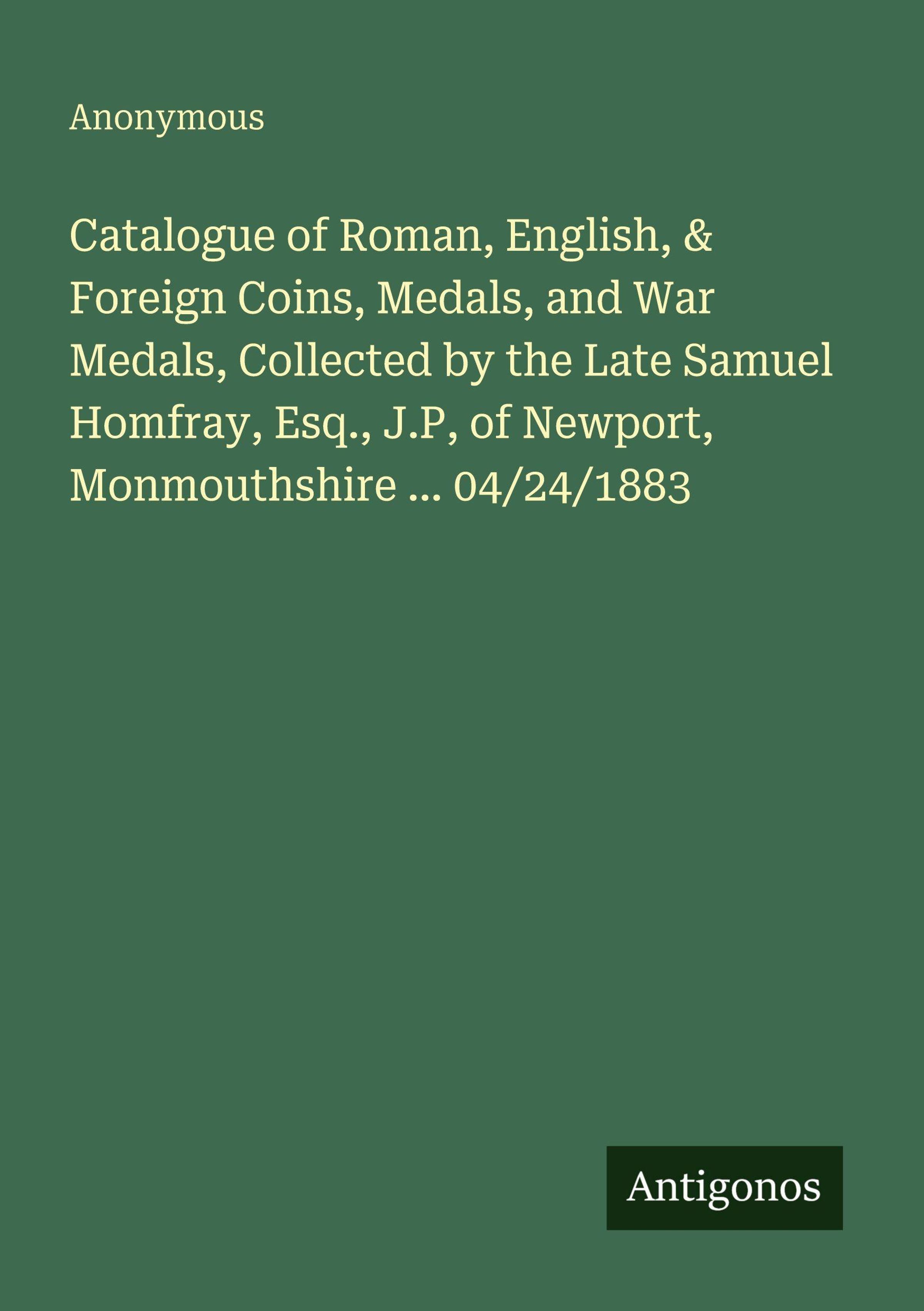 Catalogue of Roman, English, & Foreign Coins, Medals, and War Medals, Collected by the Late Samuel Homfray, Esq., J.P, of Newport, Monmouthshire ... 04/24/1883