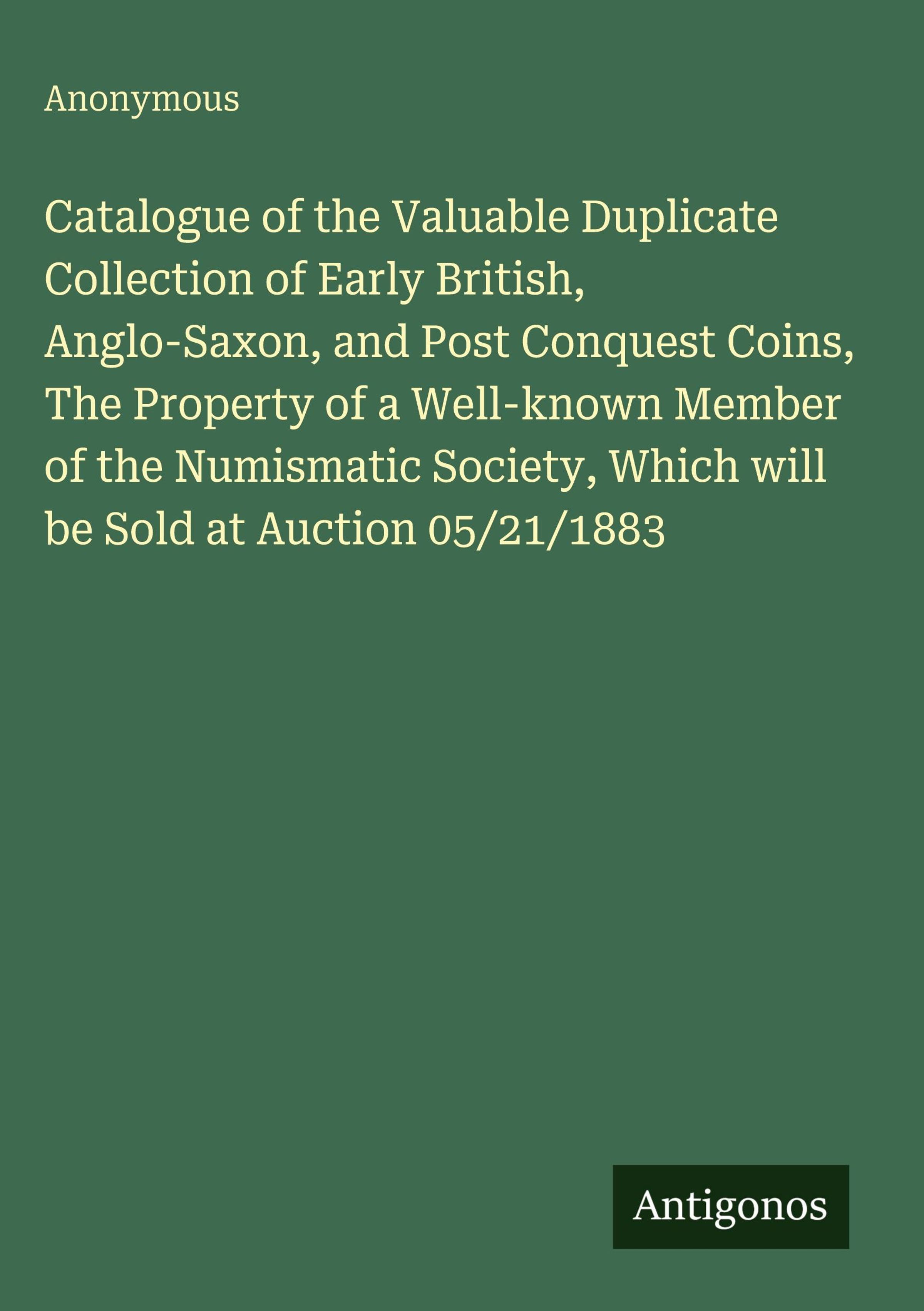 Catalogue of the Valuable Duplicate Collection of Early British, Anglo-Saxon, and Post Conquest Coins, The Property of a Well-known Member of the Numismatic Society, Which will be Sold at Auction 05/21/1883