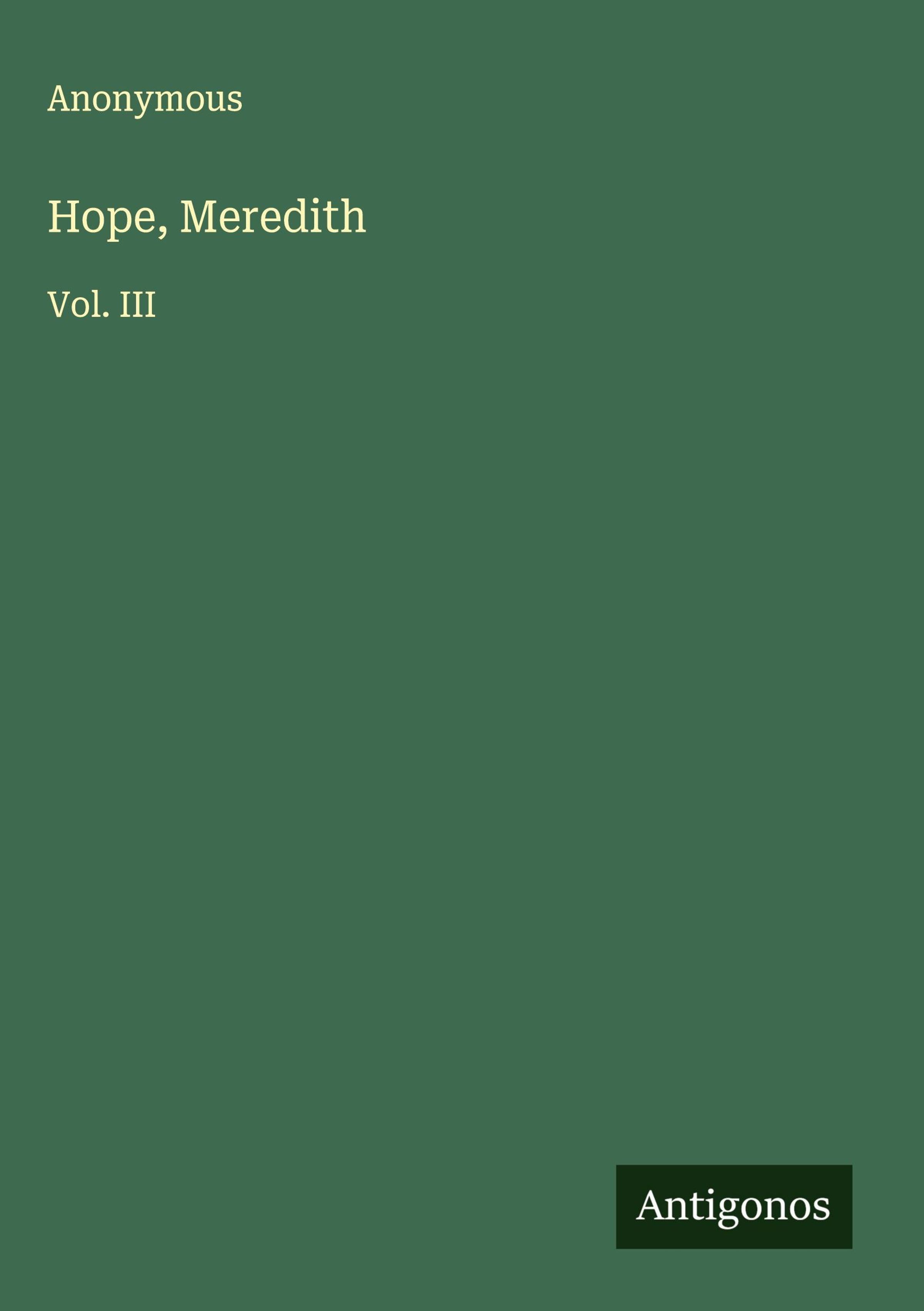 Oben steht "Anonymous", darunter "Hope, Meredith", "Vol. III". Unten rechts ein Logo mit "Antigonos". Hintergrund in Grün., Buch