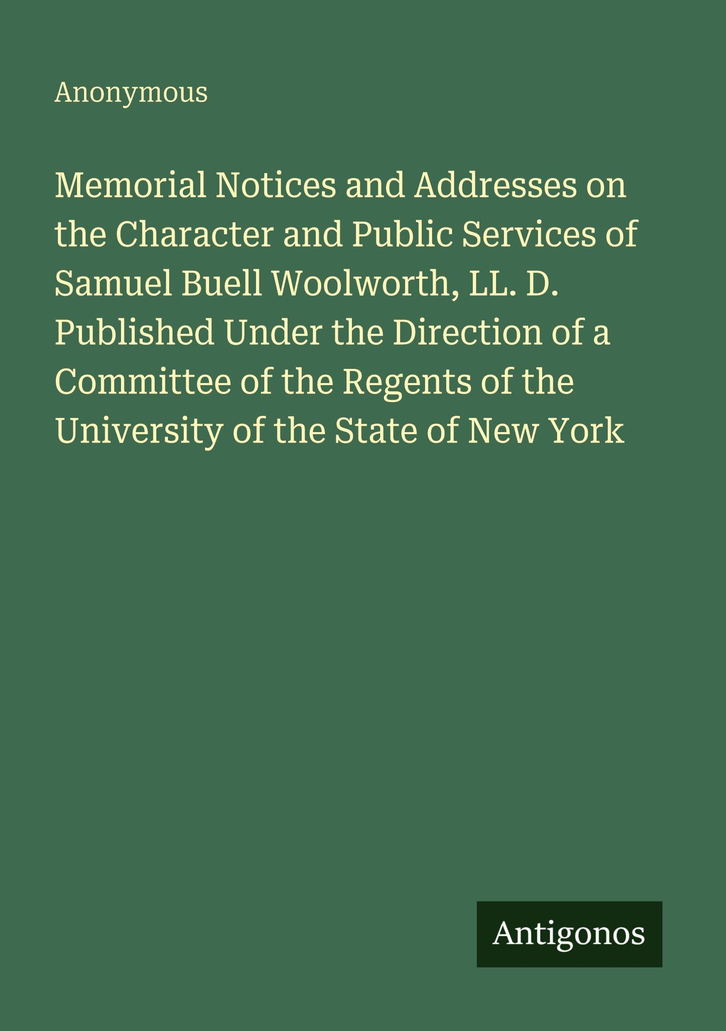 Anonymous: Memorial Notices and Addresses on the Character and Public Services of Samuel Buell Woolworth, LL. D...., Kartoniert / Broschiert