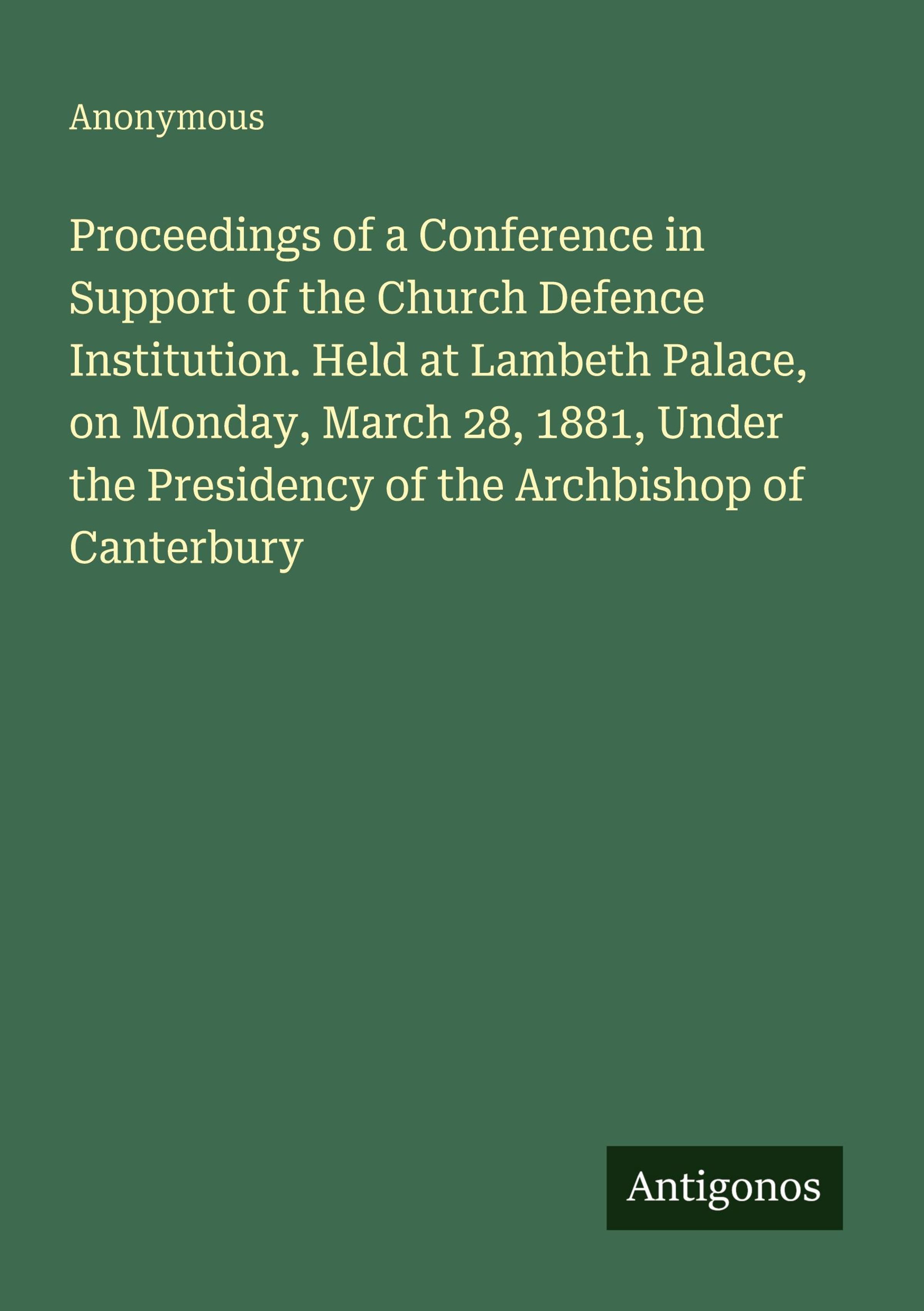 Proceedings of a Conference in Support of the Church Defence Institution. Held at Lambeth Palace, on Monday, March 28, 1881, Under the Presidency of the Archbishop of Canterbury
