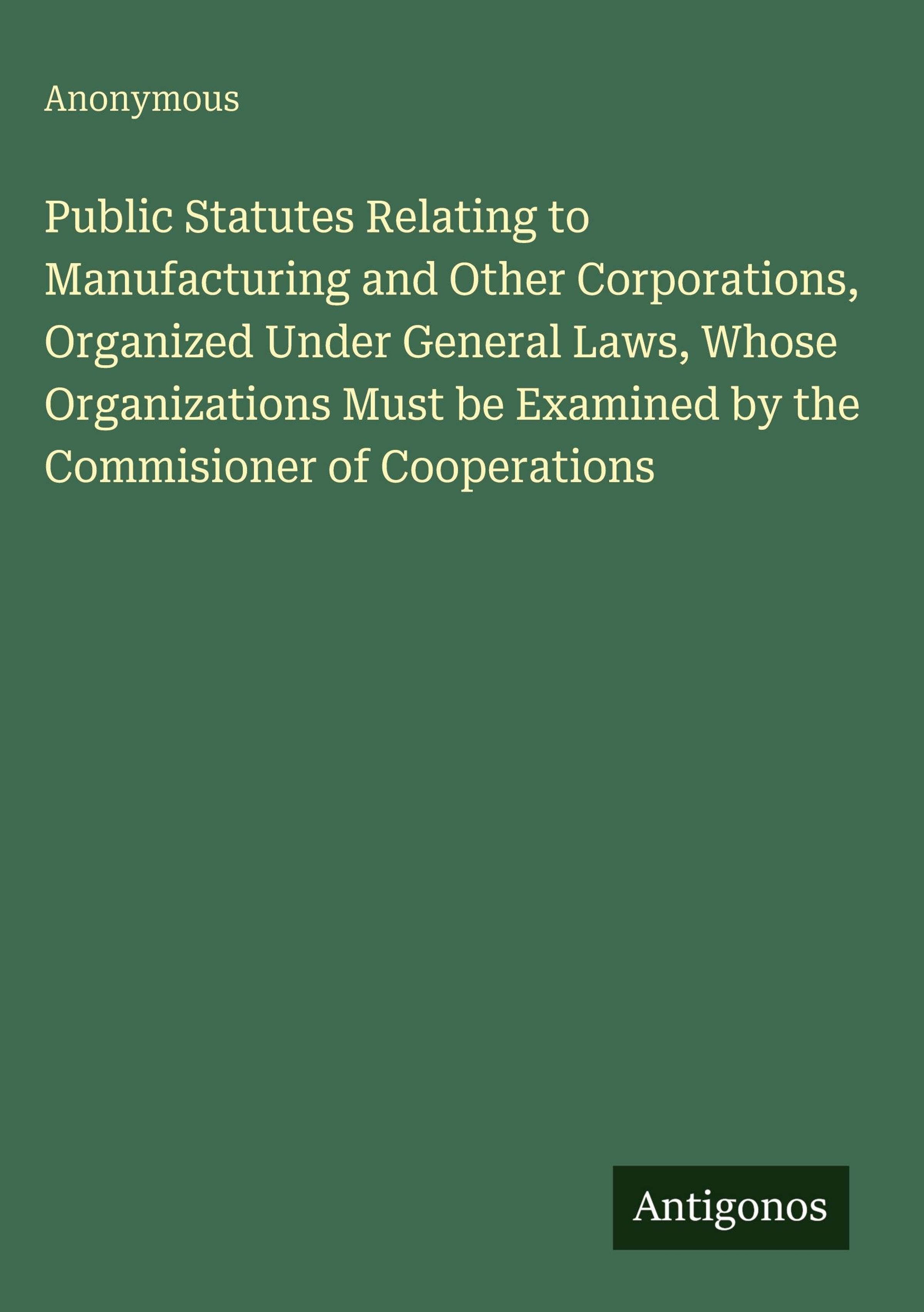 Public Statutes Relating to Manufacturing and Other Corporations, Organized Under General Laws, Whose Organizations Must be Examined by the Commisioner of Cooperations