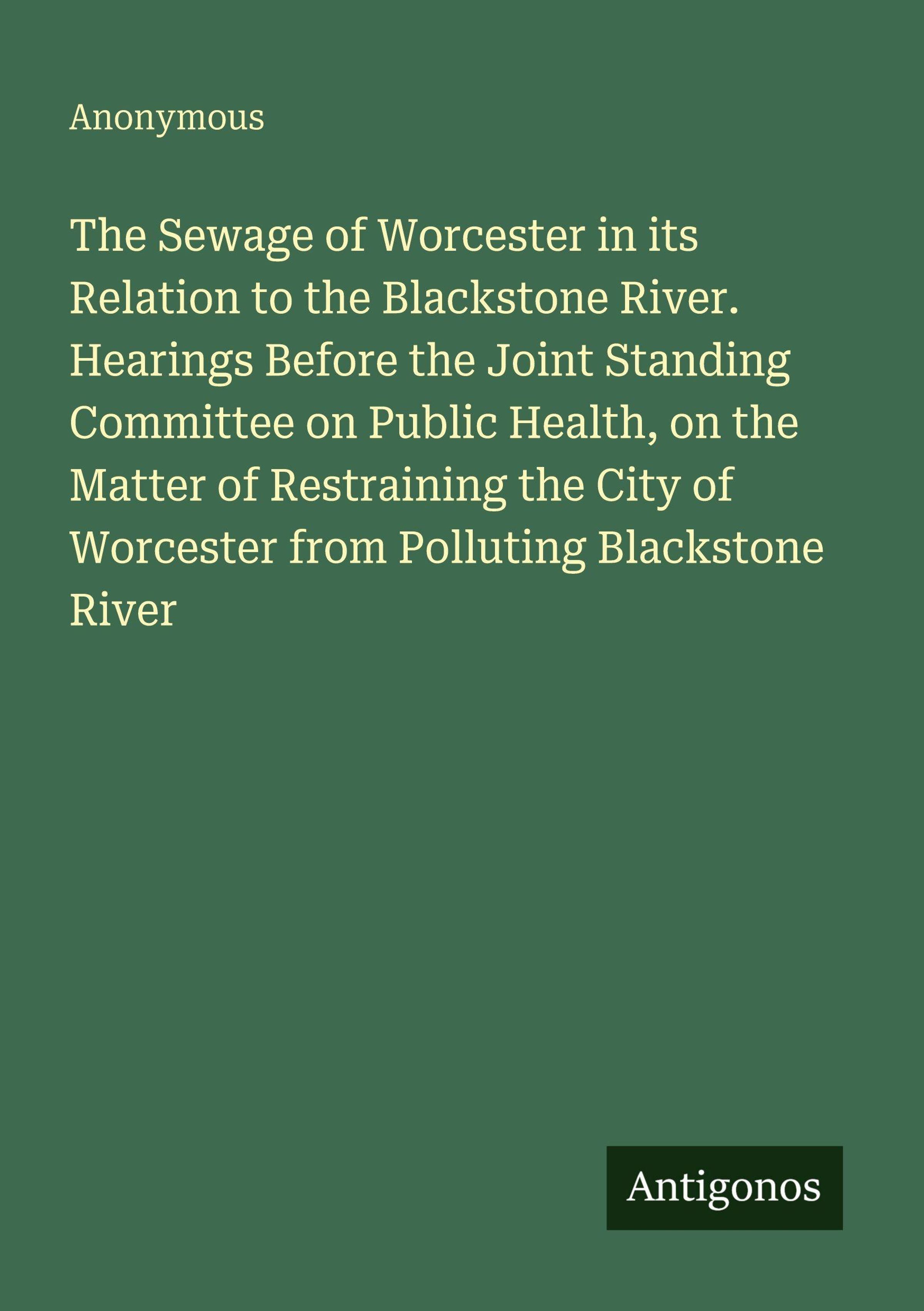 The Sewage of Worcester in its Relation to the Blackstone River. Hearings Before the Joint Standing Committee on Public Health, on the Matter of Restraining the City of Worcester from Polluting Blackstone River
