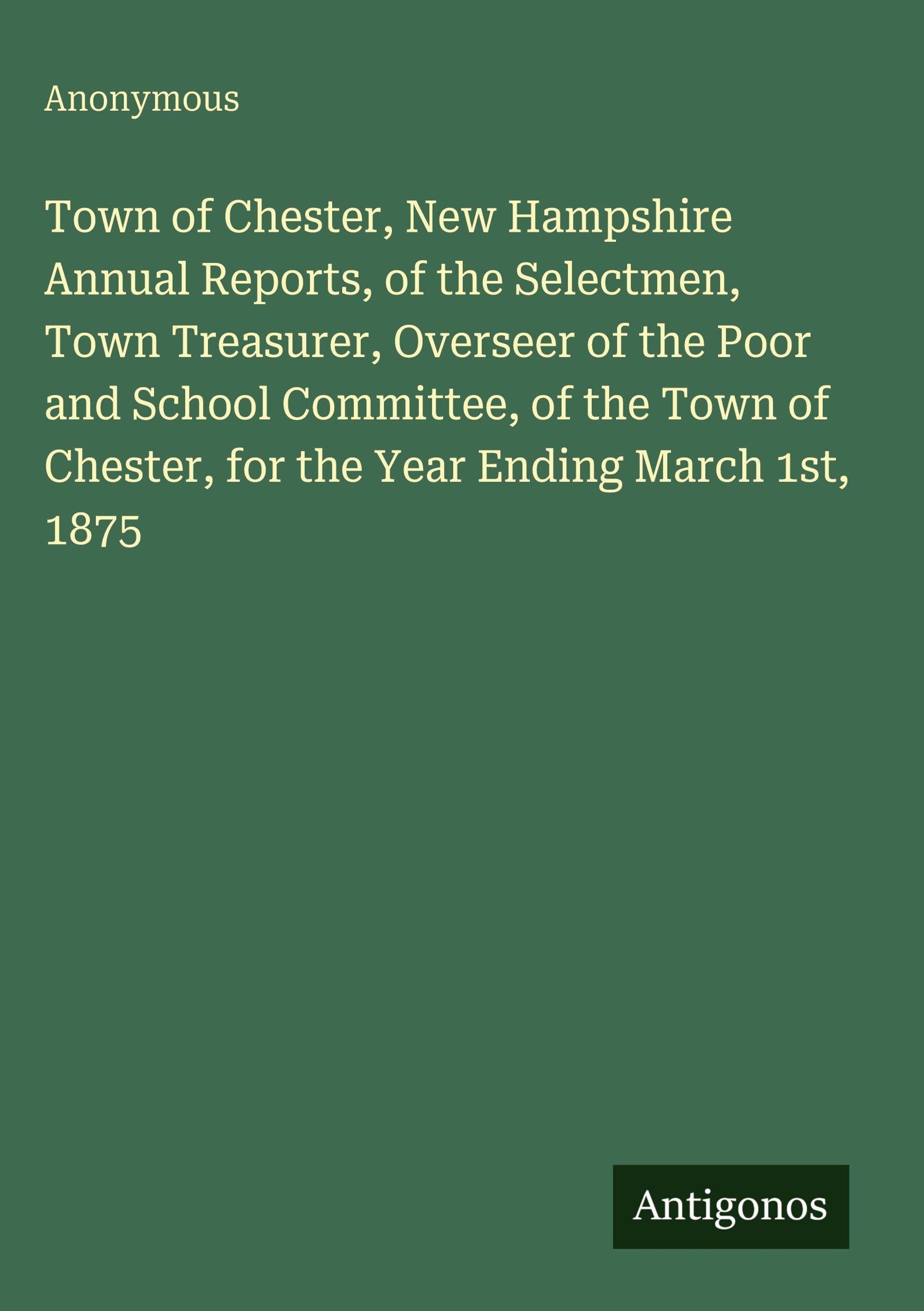 Town of Chester, New Hampshire Annual Reports, of the Selectmen, Town Treasurer, Overseer of the Poor and School Committee, of the Town of Chester, for the Year Ending March 1st, 1875