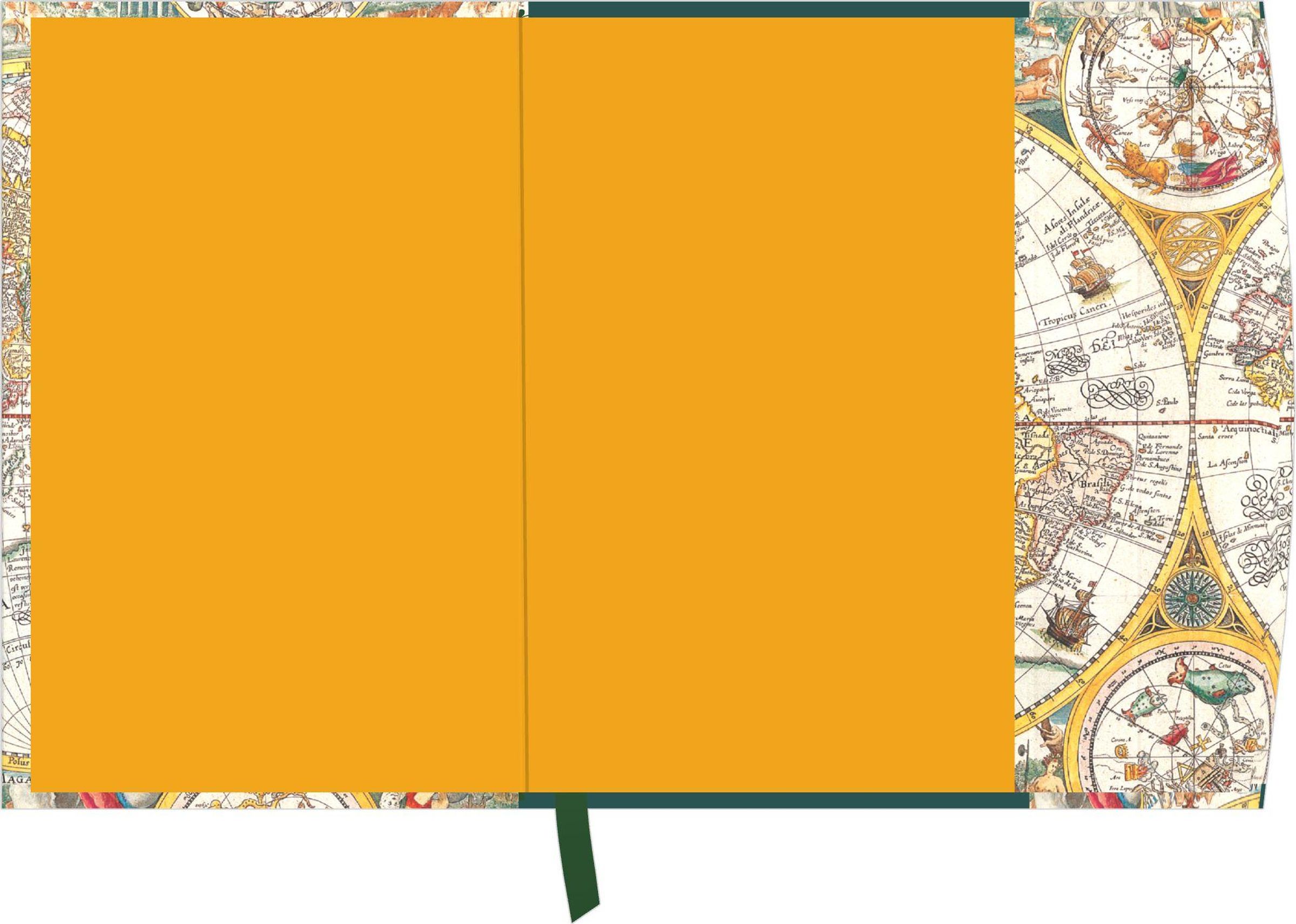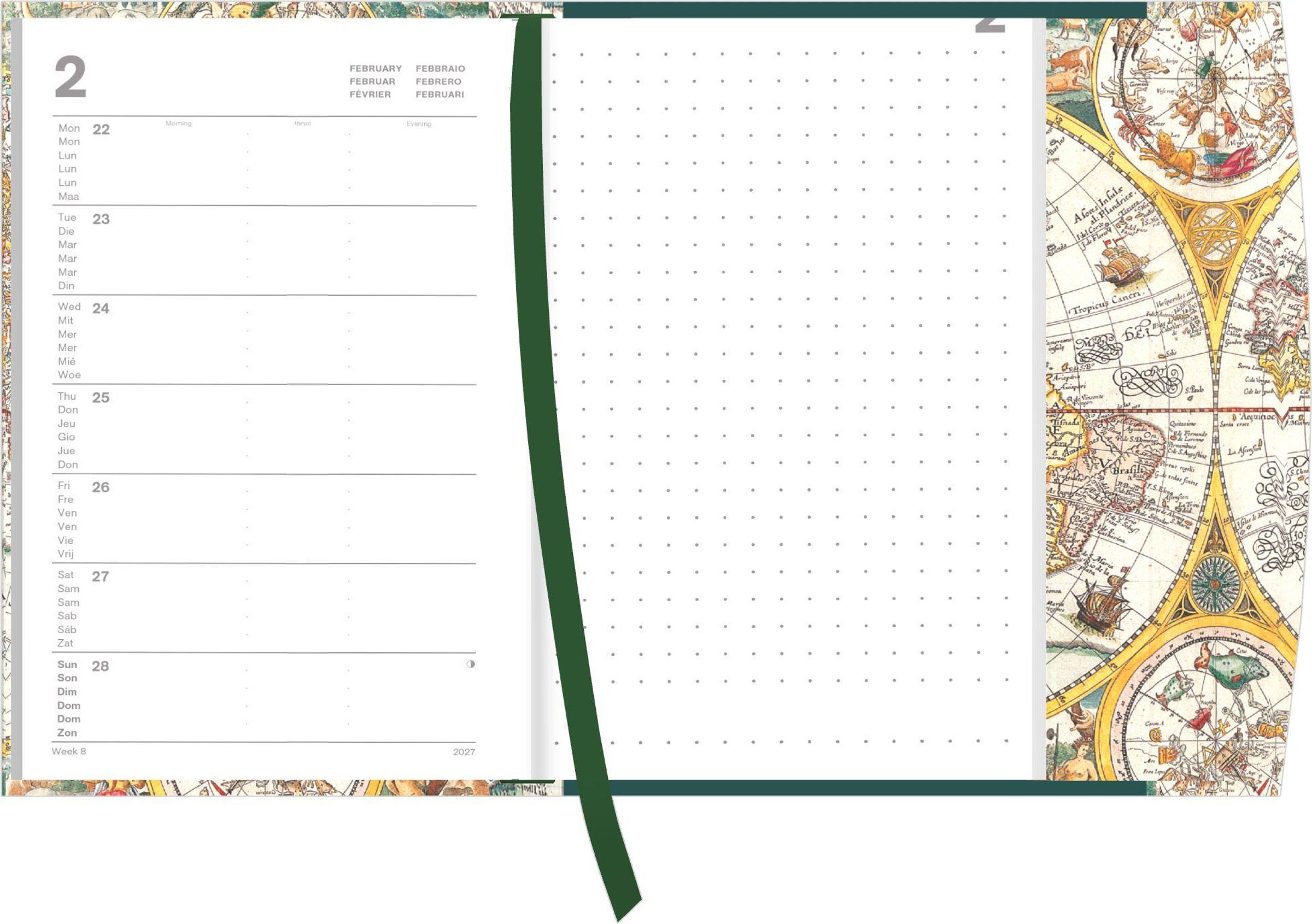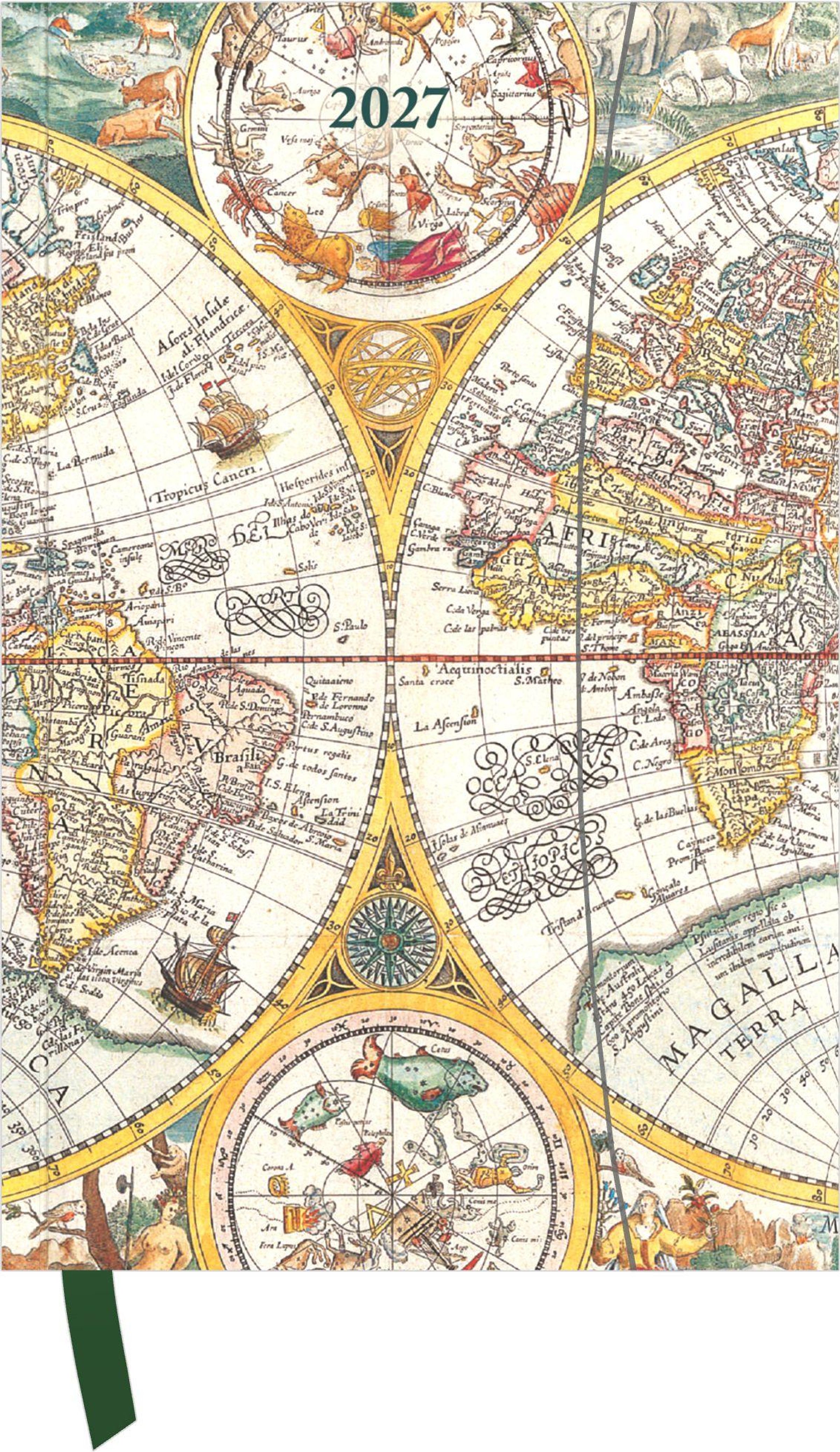 "2027" steht oben. Eine antike Weltkarte mit detaillierten Illustrationen von Tieren und Sternbildern ist dargestellt., Buch