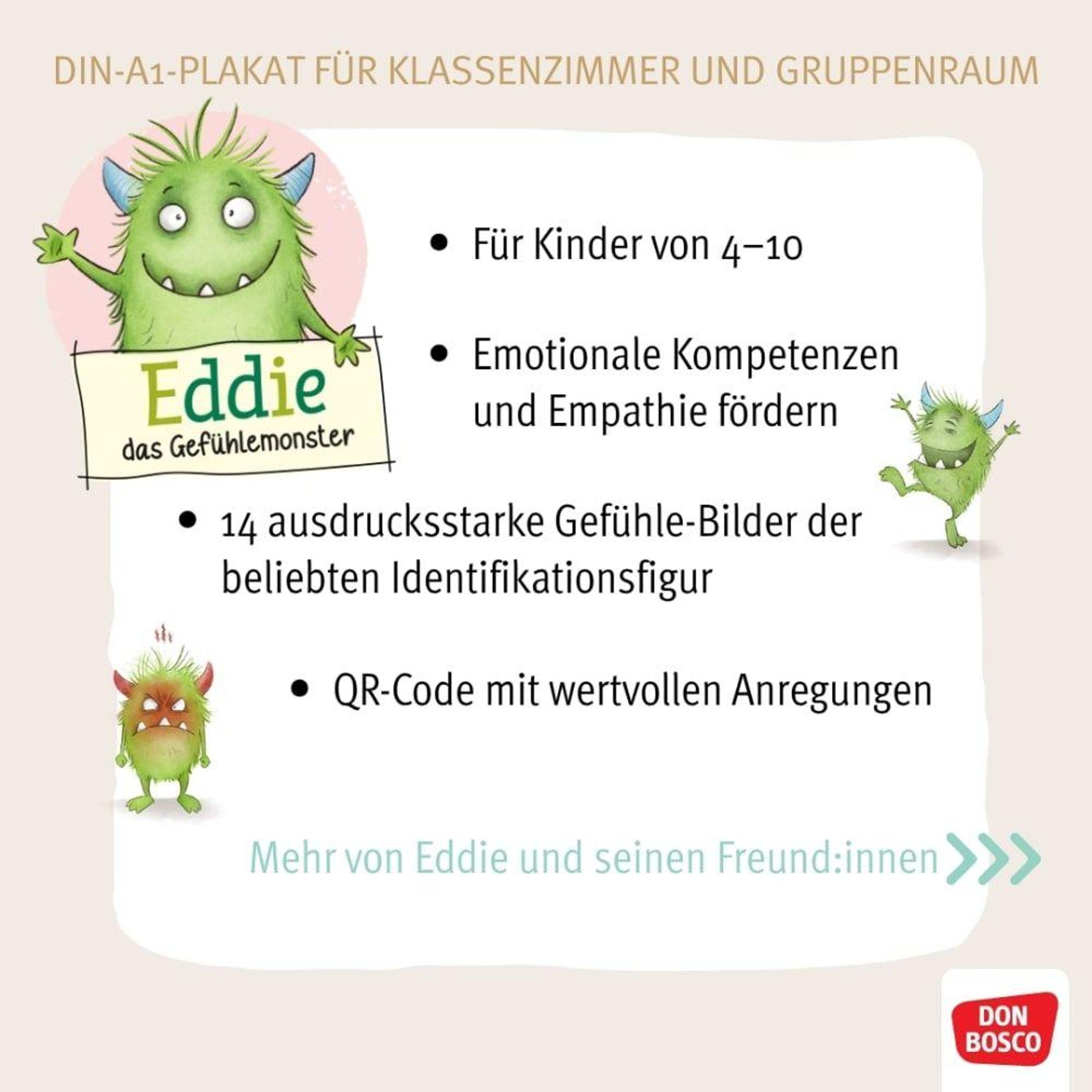 Das bekannte Gefühlemonster Eddie zeigt jetzt all seine Emotionen auf einem Plakat! 14 Gefühle sind ihm deutlich anzusehen - ideal, um mit Kindern in Kita und Grundschule gezielt über die eigenen Emotionen zu sprechen. Das großformatige Poster im Format DIN A1 kann in Gruppenräumen oder im Klassenzimmer aufgehängt werden. So lässt es sich leicht für Gesprächsanlässe im Morgenkreis und in Erzählrunden oder als Unterrichtsmaterial in der Grundschule nutzen.