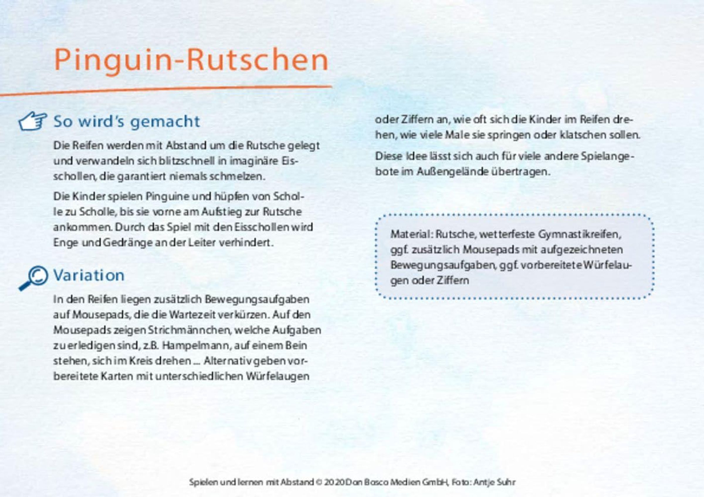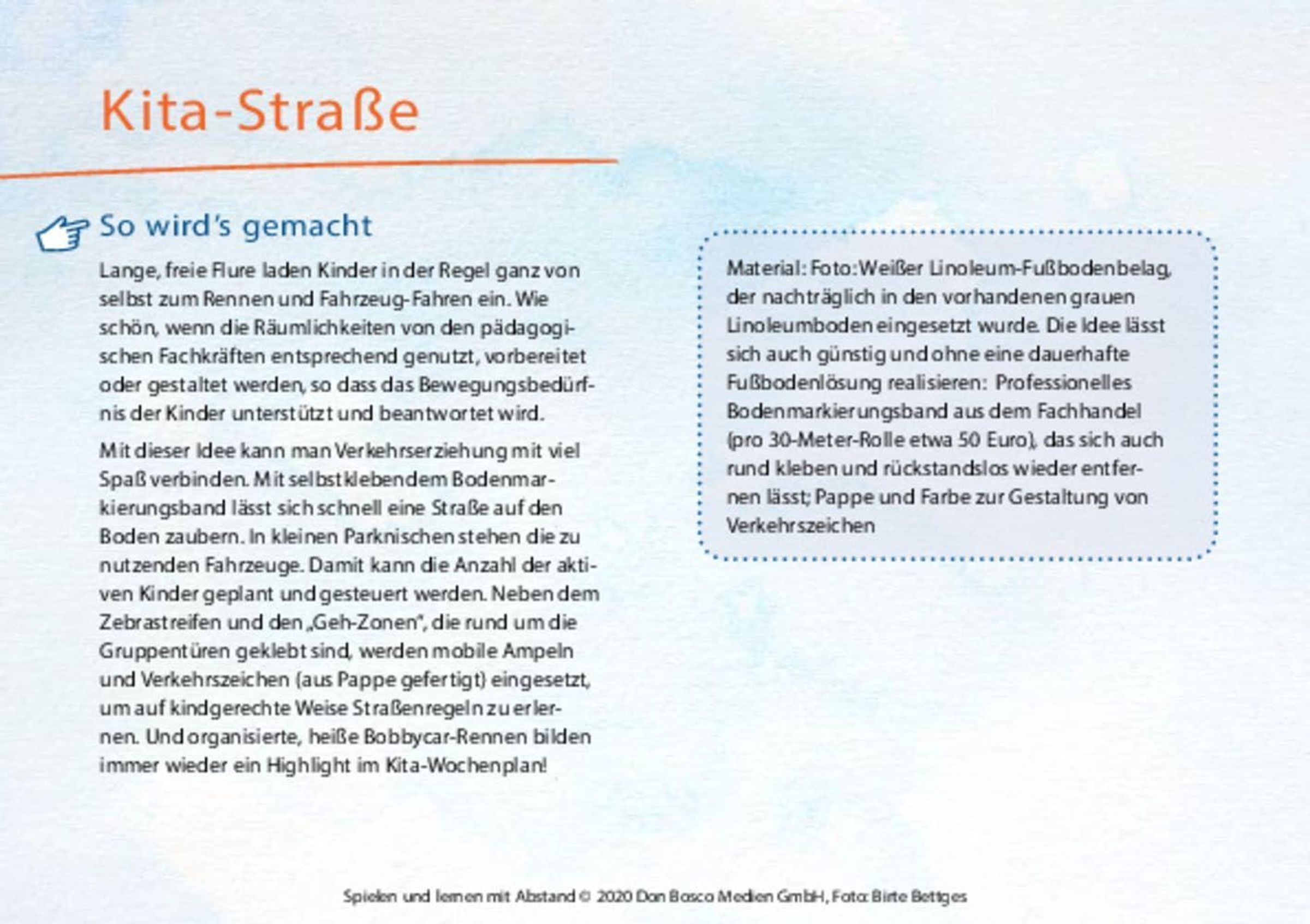 Die aktuell sehr außergewöhnliche Zeit hat dazu geführt, dass diese Foto-Box entstand, in der viele Spiel- und Bewegungsideen fotografiert und beschrieben sind. Wir können mit spannenden, kreativen und bewegten Ideen Kindergarten-Kindern spielerisch neue Regeln und Rituale, die in Infektionszeiten wichtig sind, näher bringen. Wir können Kinder davon begeistern, dass wir mal etwas ganz anderes, spannendes ausprobieren. Zusammen mit ihnen auf Abenteuerreise gehen. So können konkret räumliche Veränderungen in der Kita und im Außengelände vorgenommen werden, durch die das Einhalten von Abstandsregeln ermöglicht wird. Durch Änderungen der Rahmenbedingungen, aber auch durch kreative Spiel-, und Regelvariationen führen die vorgestellten Ideen dazu, dass sie von 1-2 Kindern bzw. von Kleingruppen mit Abstand durchgeführt werden können.