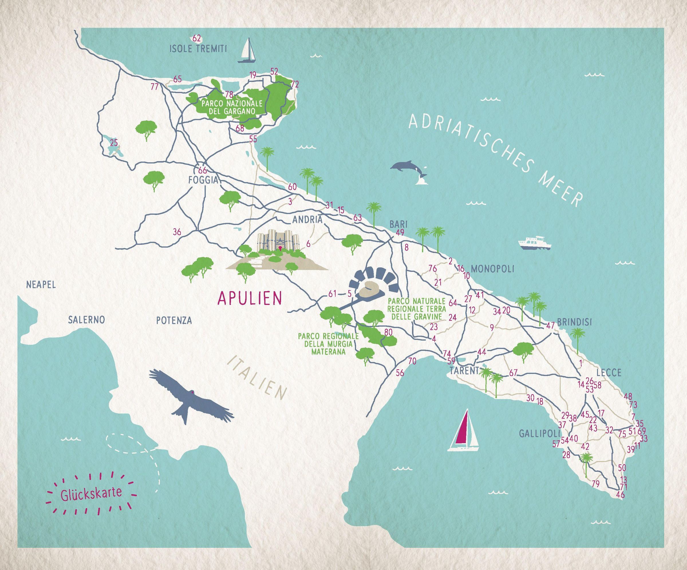 Traumhafte Strände, magische Grotten und der größte Canyon Europas: Italiens Stiefelabsatz ist ein wahres Naturparadies. Umarmt von zwei Meeren zeigt Apulien auch seine historische und kreative Seite: Antike Stätten und traditionelles Kunsthandwerk locken zu spannenden Auszeiten. Feinstes Olivenöl, erfrischendes Fenchel-Eis und selbst gemachte Orangenmarmelade zaubern köstliche Genussmomente. Ein Landstrich, der mit seinem liebevollen Charme Herz und Sinne berührt.