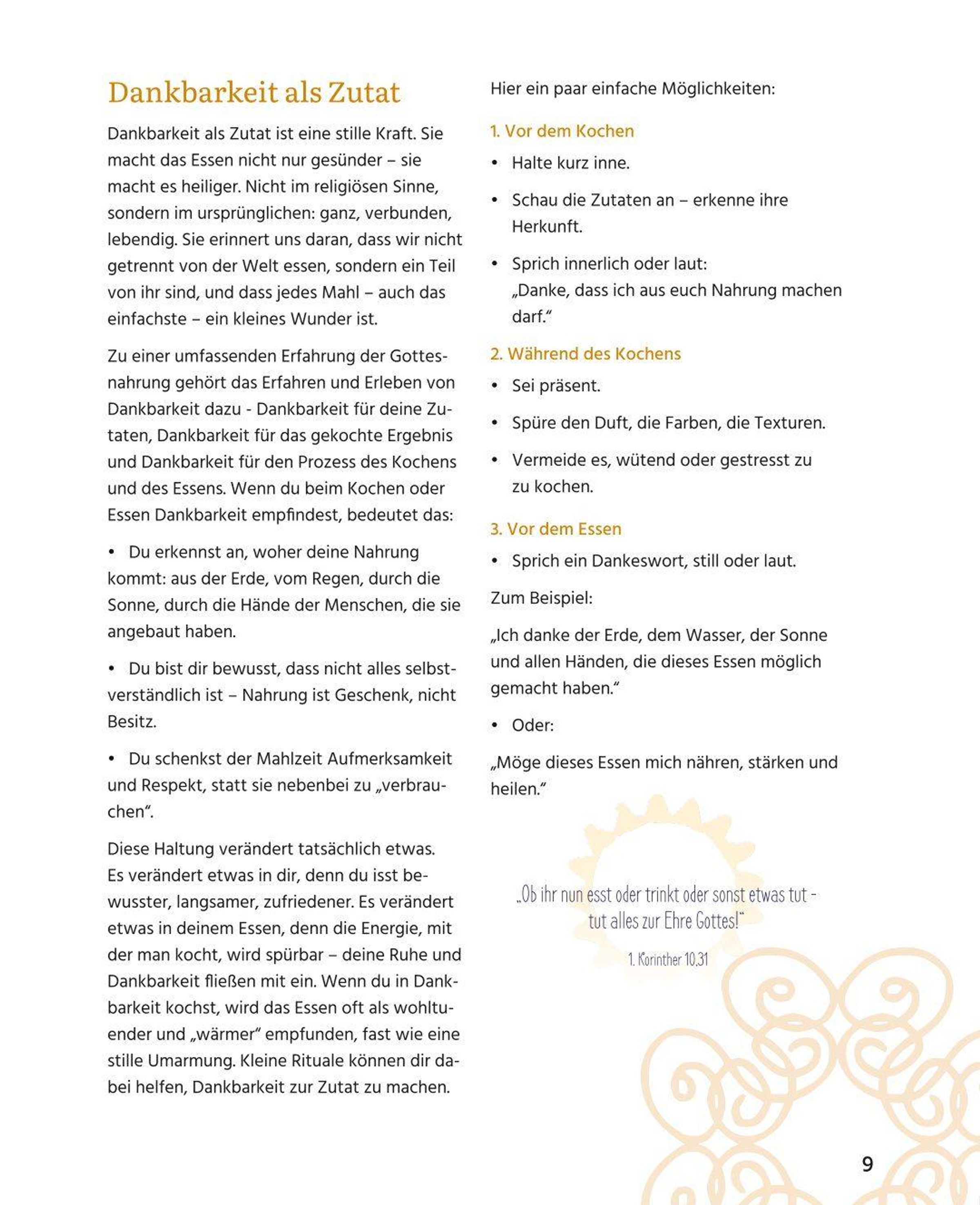 Gottesnahrung ist eine Reise zurück zur lebendigen Nahrung; zu reinen, möglichst unverarbeiteten und natürlichen Lebensmitteln. Zu einer Ernährung, die sich in Balance mit Körper und Natur befindet und zu deren Pfeilern Achtsamkeit, Saisonalität und Regionalität gehören. In jedem Fall ist es für uns eine natürliche, gesunde und "ehrliche" Art zu kochen, - auch im Sinne von Dankbarkeit gegenüber der Schöpfung oder der Natur. In einer Welt, in der Geschwindigkeit, Industrialisierung und Konsum das tägliche Leben prägen, lädt dieses Buch dich ein, einen Schritt zurückzutreten - zurück zur Einfachheit. Die Gerichte sind leicht zuzubereiten, gesund und lecker und vermitteln als wichtige Zutat Dankbarkeit, Spiritualität und Freude am Essen. Besonders wertvoll sind die Erklärungen zur ganzheitlichen Wirkung der Zutaten.