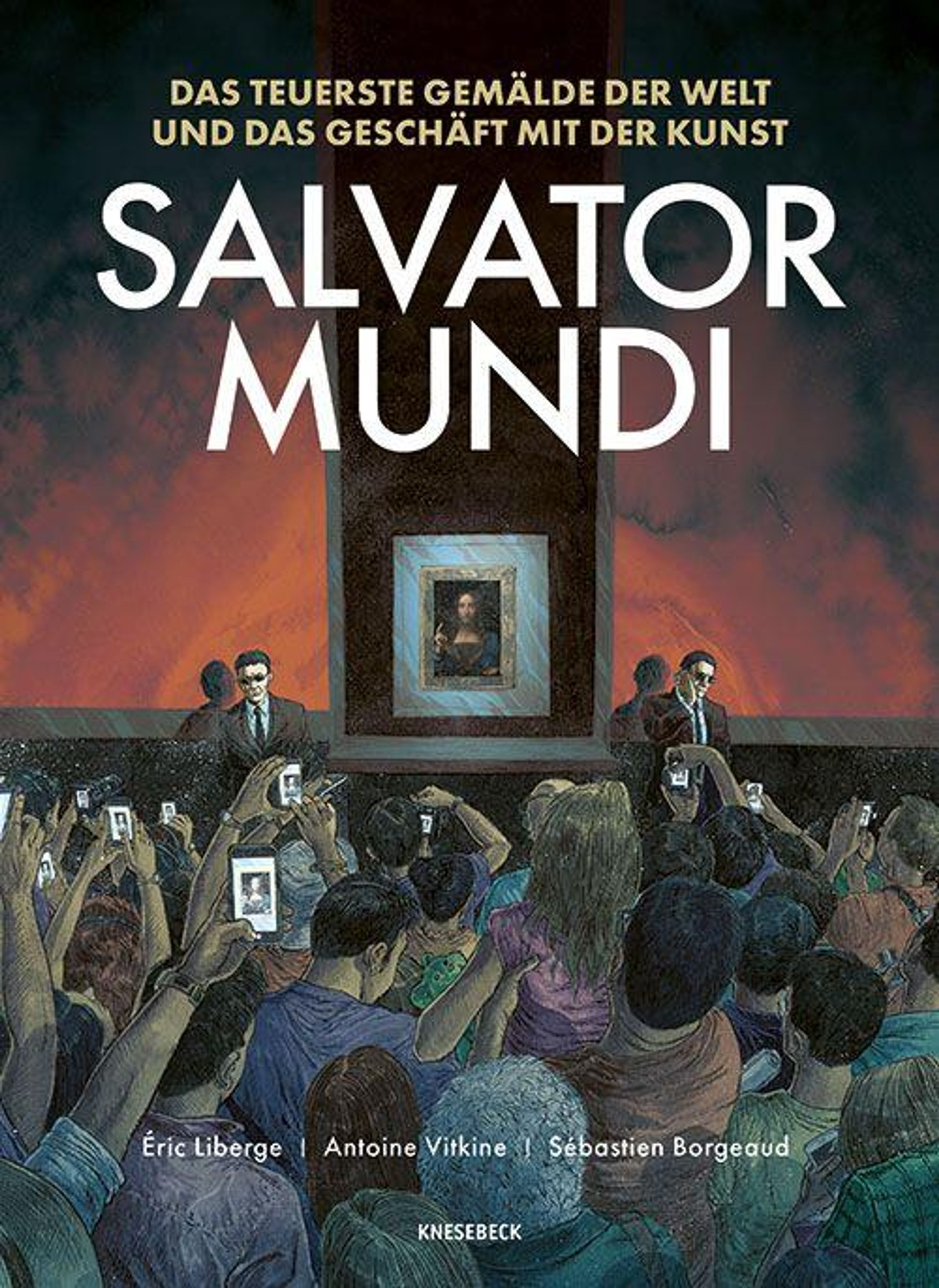 Text: "Das teuerste Gemälde der Welt und das Geschäft mit der Kunst. SALVATOR MUNDI." Illustration: Menschenmenge vor Gemälde., Buch