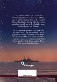 Wenn man jung ist, fühlt sich das Leben an wie eine Achterbahnfahrt der Gefühle: Dein Herz klopft so heftig, dass es einfach Liebe sein muss - oder doch Angst? Wer weiß das schon? Es ist heiß auf Usedom in jenem Sommer 2022, der Ostseestrand ist warm unter den Zehen und Finnley Kovalsky, 17, Förderschüler im letzten Schuljahr, will raus: aus der Platte, aus dem Grau, rein ins Abenteuer. Wie sein Freund Neil und der gutmütige Leif. Und plötzlich ist da auch das ukrainische Mädchen Ulja. Doch wohin verschwindet sie ständig? Und was hat es mit dem mysteriösen Oberst und immer mehr Militär auf der Insel auf sich? Mit den Gerüchten über einen bevorstehenden russischen Angriff? Während einer der Freunde die Insel militärisch verteidigen will, zweifelt der andere an den Behauptungen aus dem Netz. Und über all dem flirrt die Liebe zwischen Ulja und den Jungs in der Sommerluft - bis Finnley sich entscheiden muss, ob er bereit ist, für seine Überzeugungen alles aufs Spiel zu setzen.