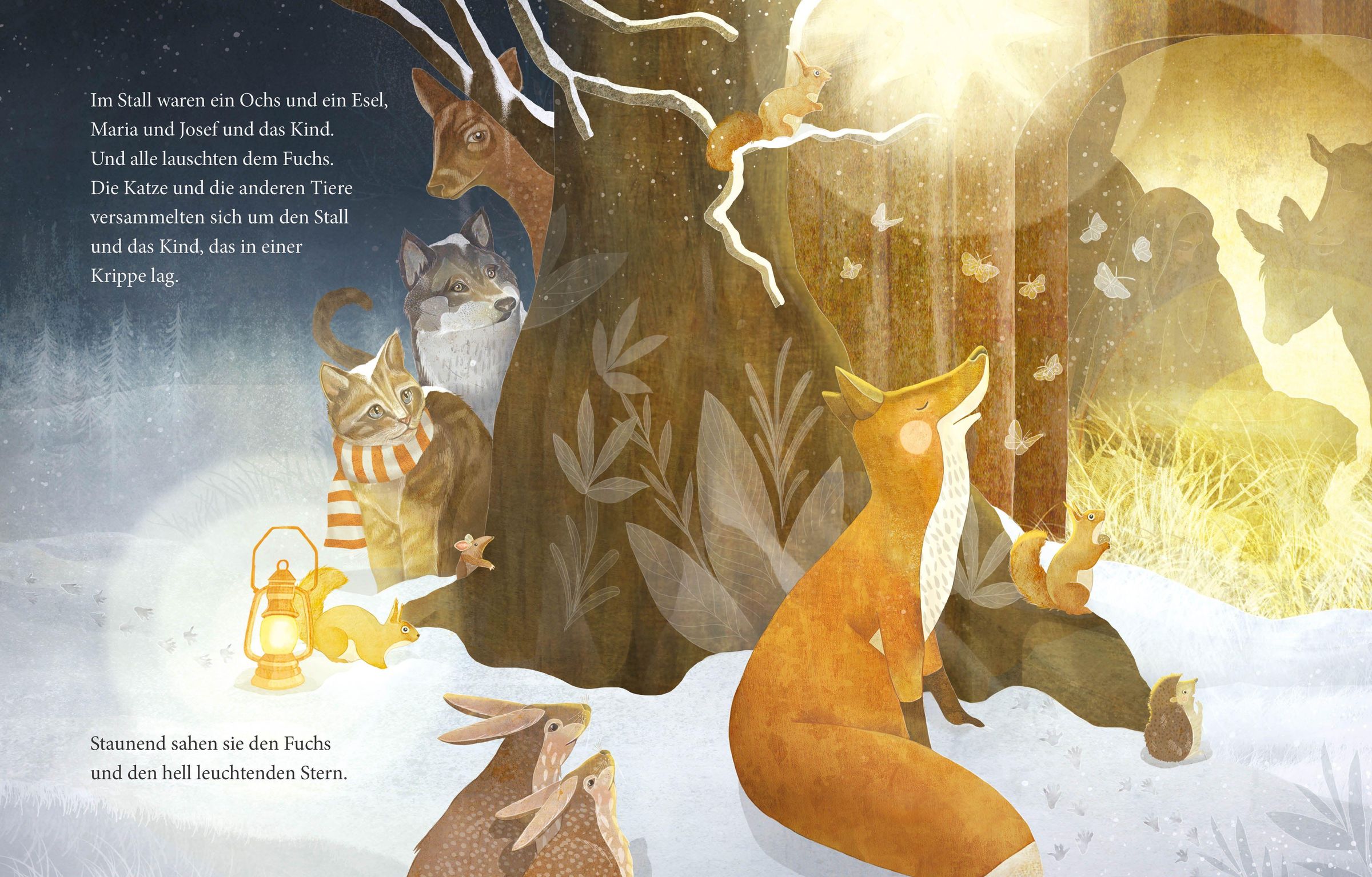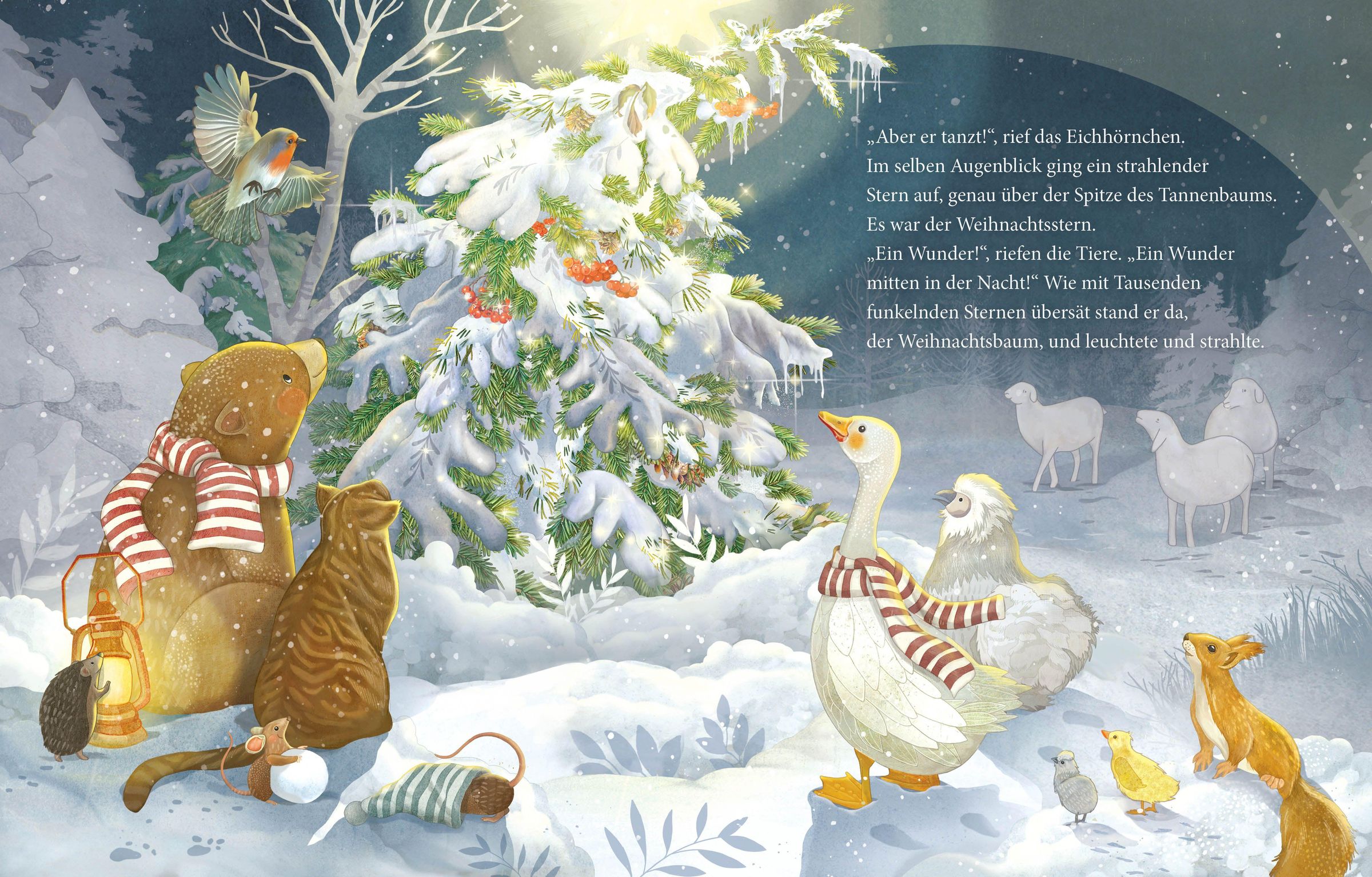 "Weihnachten mit dem kleinen Bären", Illustration mit Schneelandschaft, Tieren in Schals, Schneeflocken und einem hellen Stern., Buch
